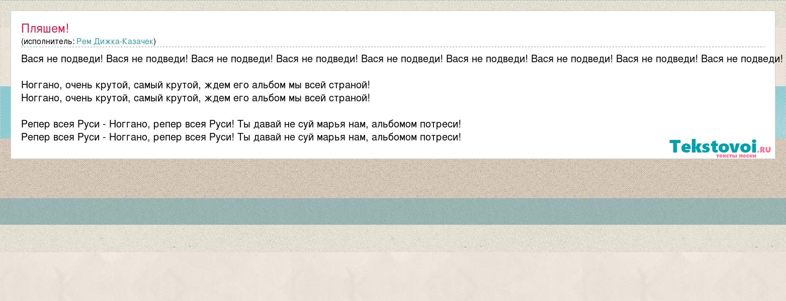Вася не подведи! Вася не подведи! Вася не подведи! Вася не подведи! Вася не подведи! Вася не подведи! Вася не подведи! Вася не подведи! Вася не подведи! Ноггано, очень крутой, самый крутой, ждем его альбом мы всей страной! Ноггано, очень крутой, самый крутой, ждем его альбом мы всей страной! Репер всея Руси - Ноггано, репер всея Руси! Ты давай не суй марья нам, альбомом потреси! Репер всея Руси - Ноггано, репер всея Руси! Ты давай не суй марья нам, альбомом потреси!