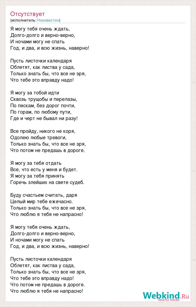 Я могу тебя очень ждать, Долго-долго и верно-верно, И ночами могу не спать Год, и два, и всю жизнь, наверно! Пусть листочки календаря Облетят, как листва у сада, Только знать бы, что все не зря, Что тебе это вправду надо! Я могу за тобой идти Сквозь трущобы и перелазы, По пескам, без дорог почти, По горам, по любому пути, Где и черт не бывал ни разу! Все пройду, никого не коря, Одолею любые тревоги, Только знать бы, что все не зря, Что потом не предашь в дороге. Я могу за тебя отдать Все, что есть у меня и будет. Я могу за тебя принять Горечь злейших на свете судеб. Буду счастьем считать, даря Целый мир тебе ежечасно. Только знать бы, что все не зря, Что люблю я тебя не напрасно! Я могу тебя очень ждать, Долго-долго и верно-верно, И ночами могу не спать Год, и два, и всю жизнь, наверно! Пусть листочки календаря Облетят, как листва у сада, Только знать бы, что все не зря, Что тебе это вправду надо! Что потом не предашь в дороге. Что люблю я тебя не напрасно!