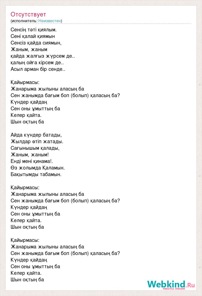 Сенсің тәті қиялым. Сені қалай қиямын Сенсіз қайда сиямын, Жаным, жаным қайда жалғыз жүрсем де.. қалың ойға кірсем де.. Асыл арман бір сенде.. Қайырмасы: Жанарыма жылыны аласың ба Сен жанымда бағым боп (болып) қаласың ба? Күндер қайдаң Сен оны ұмыттың ба Келер қайта. Шын оқтың ба Айда күндер батады, Жылдар өтіп жатады. Сағынышым қалады, Жаным, жаным! Енді мені қинама!. Өз жолымда Қаламын. Бақытымды табамын. Қайырмасы: Жанарыма жылыны аласың ба Сен жанымда бағым боп (болып) қаласың ба? Күндер қайдаң Сен оны ұмыттың ба Келер қайта. Шын оқтың ба Қайырмасы: Жанарыма жылыны аласың ба Сен жанымда бағым боп (болып) қаласың ба? Күндер қайдаң Сен оны ұмыттың ба Келер қайта. Шын оқтың ба