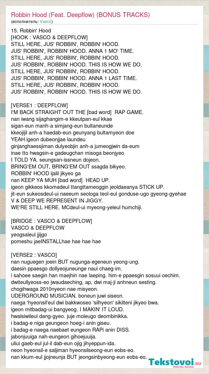 15. Robbin' Hood [HOOK : VASCO & DEEPFLOW] STILL HERE, JUS' ROBBIN', ROBBIN' HOOD. JUS' ROBBIN', ROBBIN' HOOD. ANNA 1 MO' TIME. STILL HERE, JUS' ROBBIN', ROBBIN' HOOD. JUS' ROBBIN', ROBBIN' HOOD. THIS IS HOW WE DO. STILL HERE, JUS' ROBBIN', ROBBIN' HOOD. JUS' ROBBIN', ROBBIN' HOOD. ANNA 1 LAST TIME. STILL HERE, JUS' ROBBIN', ROBBIN' HOOD. JUS' ROBBIN', ROBBIN' HOOD. THIS IS HOW WE DO. [VERSE1 : DEEPFLOW] I'M BACK STRAIGHT OUT THE [bad word] RAP GAME. nan iwang sijaghangim-e kkeutpan-eul kkae sigan-eun manh-a simjang-eun bultaneunde kkeojijil anh-a haedab-eun geunyang bultamyeon doe YEAH igeon dubeonjjae laundeu ginjanghaessjiman dulyeobjin anh-a jumeogjwin da-eum inae tto hwagsin-e gadeugchan misoga beonjyeo I TOLD YA. seungsan-issneun dojeon. BRING'EM OUT, BRING'EM OUT ssagda bikyeo. ROBBIN' HOOD ijalil jikyeo ga nan KEEP YA MUH [bad word] HEAD UP. igeon gikkeos kkomadeul ttangttameoggin jeoldaeanya STICK UP. jit-eun sukeosdeul-ui naeeum seologa teol-eul gonduse-ugo gyeong-gyehae V & DEEP WE REPRESENT IN JIGGY. WE'RE STILL HERE. MCdeul-ui myeong-yeleul humchiji. [BRIDGE : VASCO & DEEPFLOW] VASCO & DEEPFLOW yeogsaleul jjijgo pomeshu jaeINSTALLhae hae hae hae [VERSE2 : VASCO] nan nuguegen joein BUT nugunga-egeneun yeong-ung. daesin ppaesgo dollyeojuneunge naui chaeg-im. i sahoee saegin han maejhin nae laeping. him-e ppaesgin sosuui oechim. dwiteullyeoss-eo jwaudaeching, ap, dwi maj-ji anhneun sesting. chogihwaga 2010nyeon nae misyeon. UDERGROUND MUSICIAN. boneun juwi siseon. naega 'hyeonsil'eul dwi bakkwoseo 'silhyeon' sikilteni jikyeo bwa. igeon mitbadag-ui bangyeog. I MAKIN' IT LOUD. hwalsiwileul dang-gyeo. juje moleugo deombinikka. i badag-e niga geungeon hoeg-i anin giseu. i badag-e naega naebaet eungeon RAPi anin DISS. jabonjuuiga nah-eungeon gihoejuuija. uliui gaeb-eul jul-il dab-eun ojig jihyeppun-ida. neon hyeonsil-e saljiman hyeonsilseong-eun eobs-eo. nan kkum-eul jjojneunja BUT jeongsinbyeong-eun eobs-eo.
