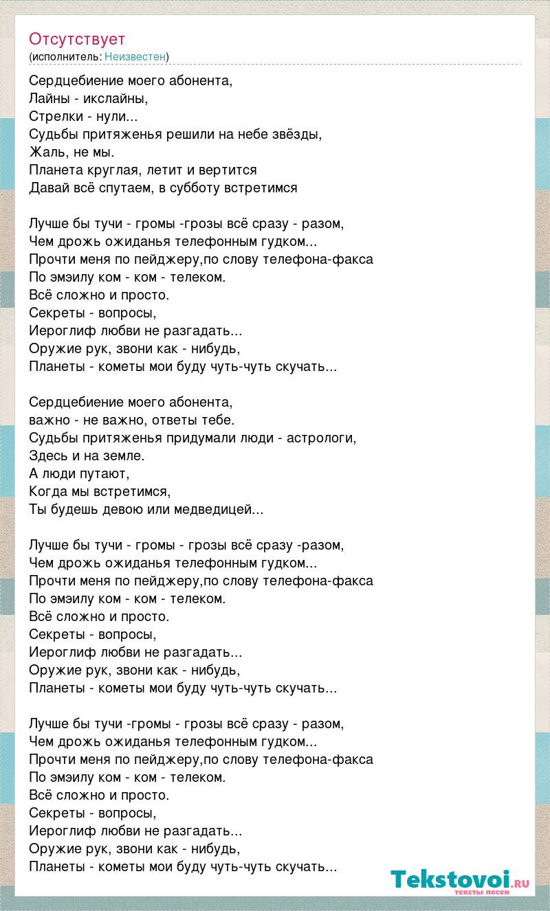Сердцебиение моего абонента, Лайны - икслайны, Стрелки - нули... Судьбы притяженья решили на небе звёзды, Жаль, не мы. Планета круглая, летит и вертится Давай всё спутаем, в субботу встретимся Лучше бы тучи - громы -грозы всё сразу - разом, Чем дрожь ожиданья телефонным гудком... Прочти меня по пейджеру,по слову телефона-факcа По эмэилу ком - ком - телеком. Всё сложно и просто. Секреты - вопросы, Иероглиф любви не разгадать... Оружие рук, звони как - нибудь, Планеты - кометы мои буду чуть-чуть скучать... Сердцебиение моего абонента, важно - не важно, ответы тебе. Судьбы притяженья придумали люди - астрологи, Здесь и на земле. А люди путают, Когда мы встретимся, Ты будешь девою или медведицей... Лучше бы тучи - громы - грозы всё сразу -разом, Чем дрожь ожиданья телефонным гудком... Прочти меня по пейджеру,по слову телефона-факса По эмэилу ком - ком - телеком. Всё сложно и просто. Секреты - вопросы, Иероглиф любви не разгадать... Оружие рук, звони как - нибудь, Планеты - кометы мои буду чуть-чуть скучать... Лучше бы тучи -громы - грозы всё сразу - разом, Чем дрожь ожиданья телефонным гудком... Прочти меня по пейджеру,по слову телефона-факса По эмэилу ком - ком - телеком. Всё сложно и просто. Секреты - вопросы, Иероглиф любви не разгадать... Оружие рук, звони как - нибудь, Планеты - кометы мои буду чуть-чуть скучать...