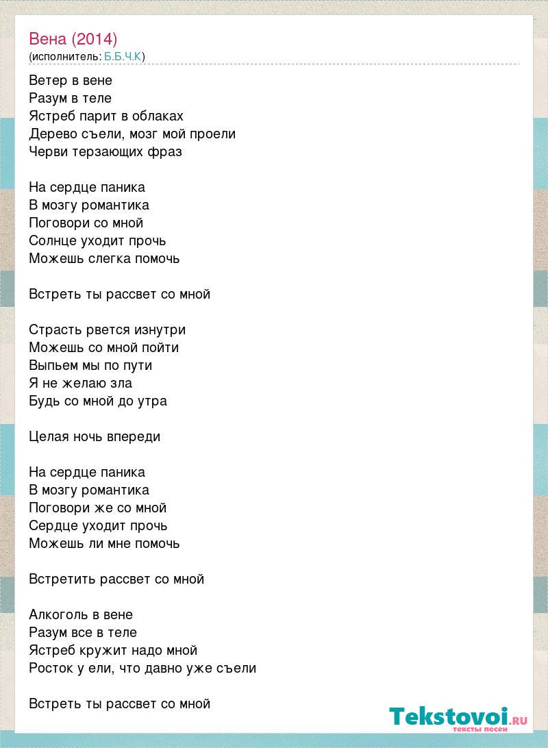 Ветер в вене Разум в теле Ястреб парит в облаках Дерево съели, мозг мой проели Черви терзающих фраз На сердце паника В мозгу романтика Поговори со мной Солнце уходит прочь Можешь слегка помочь Встреть ты рассвет со мной Страсть рвется изнутри Можешь со мной пойти Выпьем мы по пути Я не желаю зла Будь со мной до утра Целая ночь впереди На сердце паника В мозгу романтика Поговори же со мной Сердце уходит прочь Можешь ли мне помочь Встретить рассвет со мной Алкоголь в вене Разум все в теле Ястреб кружит надо мной Росток у ели, что давно уже съели Встреть ты рассвет со мной