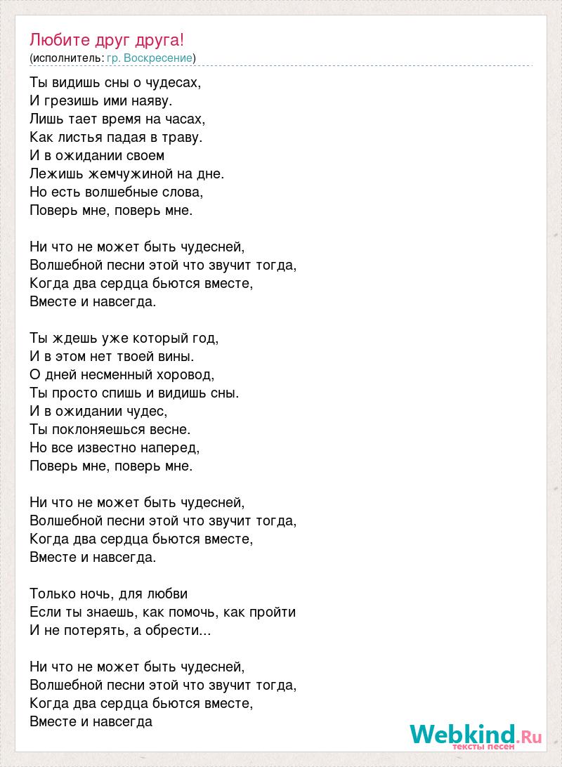 Ты видишь сны о чудесах, И грезишь ими наяву. Лишь тает время на часах, Как листья падая в траву. И в ожидании своем Лежишь жемчужиной на дне. Но есть волшебные слова, Поверь мне, поверь мне. Ни что не может быть чудесней, Волшебной песни этой что звучит тогда, Когда два сердца бьются вместе, Вместе и навсегда. Ты ждешь уже который год, И в этом нет твоей вины. О дней несменный хоровод, Ты просто спишь и видишь сны. И в ожидании чудес, Ты поклоняешься весне. Но все известно наперед, Поверь мне, поверь мне. Ни что не может быть чудесней, Волшебной песни этой что звучит тогда, Когда два сердца бьются вместе, Вместе и навсегда. Только ночь, для любви Если ты знаешь, как помочь, как пройти И не потерять, а обрести... Ни что не может быть чудесней, Волшебной песни этой что звучит тогда, Когда два сердца бьются вместе, Вместе и навсегда