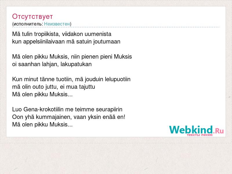 Mä tulin tropiikista, viidakon uumenista kun appelsiinilaivaan mä satuin joutumaan Mä olen pikku Muksis, niin pienen pieni Muksis oi saanhan lahjan, lakupatukan Kun minut tänne tuotiin, mä jouduin lelupuotiin mä olin outo juttu, ei mua tajuttu Mä olen pikku Muksis... Luo Gena-krokotiilin me teimme seurapiirin Oon yhä kummajainen, vaan yksin enää en! Mä olen pikku Muksis...