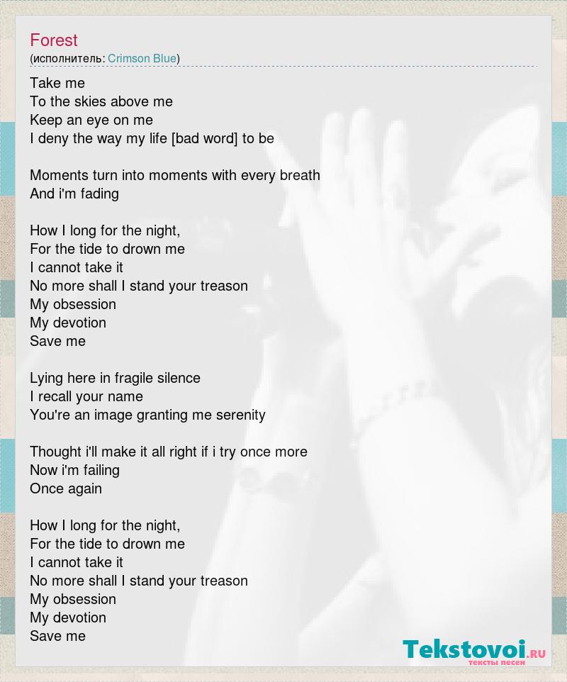 Take me To the skies above me Keep an eye on me I deny the way my life [bad word] to be Moments turn into moments with every breath And i'm fading How I long for the night, For the tide to drown me I cannot take it No more shall I stand your treason My obsession My devotion Save me Lying here in fragile silence I recall your name You're an image granting me serenity Thought i'll make it all right if i try once more Now i'm failing Once again How I long for the night, For the tide to drown me I cannot take it No more shall I stand your treason My obsession My devotion Save me