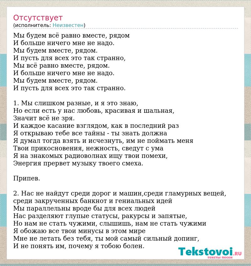 Мы будем всё равно вместе, рядом И больше ничего мне не надо. Мы будем вместе, рядом. И пусть для всех это так странно, Мы всё равно вместе, рядом. И больше ничего мне не надо. Мы будем вместе, рядом. И пусть для всех это так странно. 1. Мы слишком разные, и я это знаю, Но если есть у нас любовь, красивая и шальная, Значит всё не зря. И каждое касание взглядом, как в последний раз Я открываю тебе все тайны - ты знать должна Я думал тогда взять и исчезнуть, им не поймать меня Твои прикосновения, нежность, сведут с ума Я на знакомых радиоволнах ищу твои помехи, Энергия прервет музыку твоего смеха. Припев. 2. Нас не найдут среди дорог и машин,среди гламурных вещей, среди закрученных банкнот и гениальных идей Мы параллельны вроде бы для всех людей Нас разделяют глупые статусы, ракурсы и запятые, Но нам не стать чужими, слышишь, нам не стать чужими Я обожаю все твои минусы в этом мире Мне не летать без тебя, ты мой самый сильный допинг, И не понять им, почему я тобою болен.