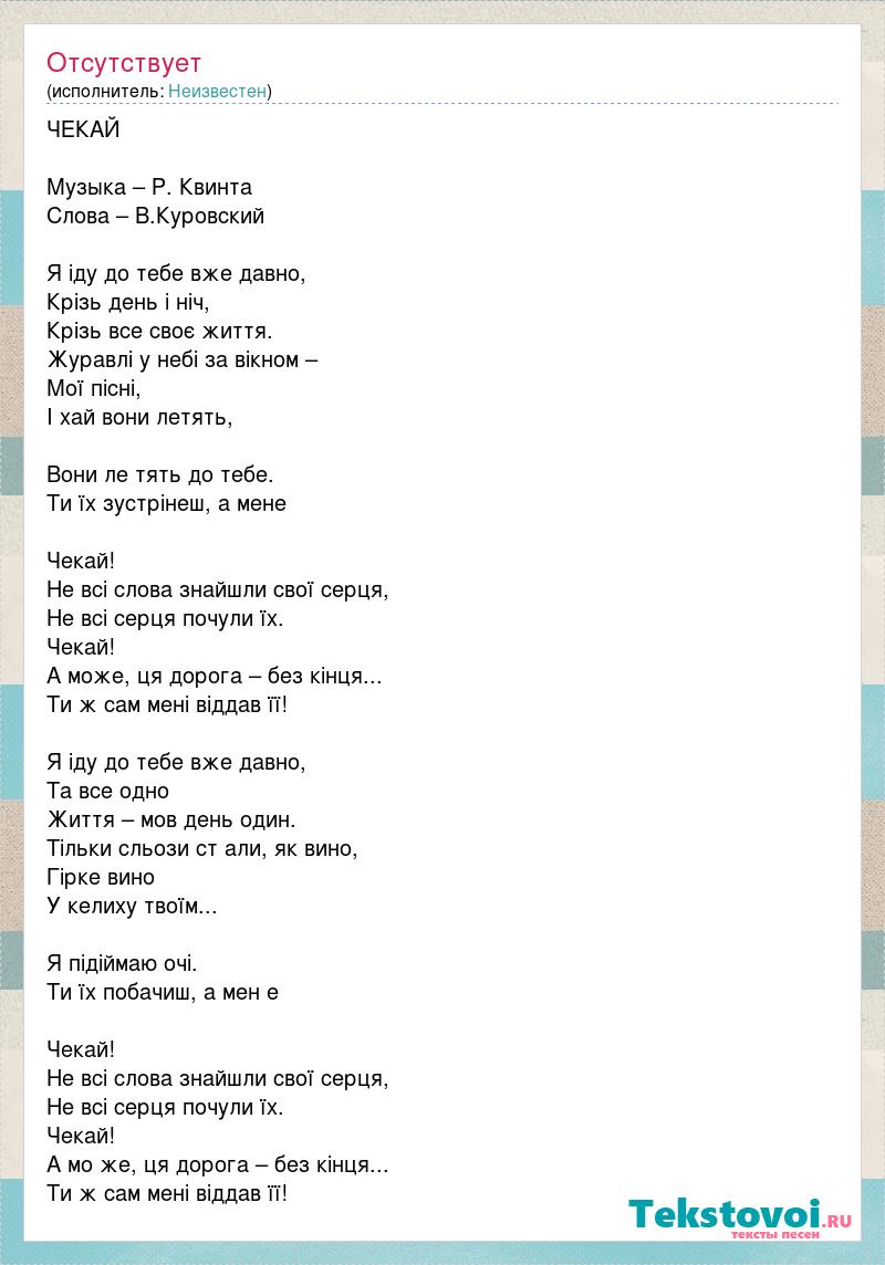 ЧЕКАЙ Музыка – Р. Квинта Слова – В.Куровский Я iду до тебе вже давно, Крiзь день i нiч, Крiзь все своє життя. Журавлi у небi за вiкном – Мої пiснi, I хай вони летять, Вони ле тять до тебе. Ти їх зустрiнеш, а мене Чекай! Не всi слова знайшли свої серця, Не всi серця почули їх. Чекай! А може, ця дорога – без кiнця... Ти ж сам менi вiддав її! Я iду до тебе вже давно, Та все одно Життя – мов день один. Тiльки сльози ст али, як вино, Гiрке вино У келиху твоїм... Я пiдiймаю очi. Ти їх побачиш, а мен е Чекай! Не всi слова знайшли свої серця, Не всi серця почули їх. Чекай! А мо же, ця дорога – без кiнця... Ти ж сам менi вiддав її!