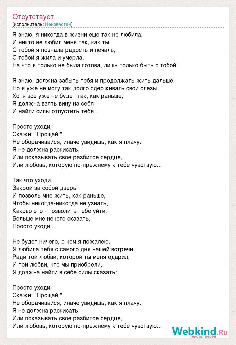 Я знаю, я никогда в жизни еще так не любила, И никто не любил меня так, как ты. С тобой я познала радость и печаль, С тобой я жила и умерла, На что я только не была готова, лишь только быть с тобой! Я знаю, должна забыть тебя и продолжать жить дальше, Но я уже не могу так долго сдерживать свои слезы. Хотя все уже не будет так, как раньше, Я должна взять вину на себя И найти силы отпустить тебя.... Просто уходи, Скажи: "Прощай!" Не оборачивайся, иначе увидишь, как я плачу. Я не должна раскисать, Или показывать свое разбитое сердце, Или любовь, которую по-прежнему к тебе чувствую... Так что уходи, Закрой за собой дверь И позволь мне жить, как раньше, Чтобы никогда-никогда не узнать, Каково это - позволить тебе уйти. Больше мне нечего сказать, Просто уходи... Не будет ничего, о чем я пожалею. Я любила тебя с самого дня нашей встречи. Ради той любви, которой ты меня одарил, И той любви, что мы приобрели, Я должна найти в себе силы сказать: Просто уходи, Скажи: "Прощай!" Не оборачивайся, иначе увидишь, как я плачу. Я не должна раскисать, Или показывать свое разбитое сердце, Или любовь, которую по-прежнему к тебе чувствую...