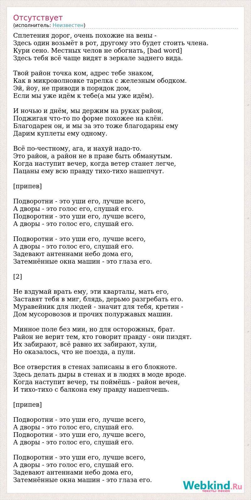 Сплетения дорог, очень похожие на вены - Здесь один возьмёт в рот, другому это будет стоить члена. Кури сено. Местных челов не обогнать, [bad word] Здесь тебя всё чаще видят в зеркале заднего вида. Твой район точка ком, адрес тебе знаком, Как в микроволновке тарелка с железным ободком. Эй, йоу, не приводи в порядок дом, Если мы уже идём к тебе(а мы уже идём). И ночью и днём, мы держим на руках район, Поджигая что-то по форме похожее на клён. Благодарен он, и мы за это тоже благодарны ему Дарим куплеты ему одному. Всё по-честному, ага, и нахуй надо-то. Это район, а район не в праве быть обманутым. Когда наступит вечер, когда ветер станет легче, Пацаны ему всю правду тихо-тихо нашепчут. [припев] Подворотни - это уши его, лучше всего, А дворы - это голос его, слушай его. Подворотни - это уши его, лучше всего, А дворы - это голос его, слушай его. Подворотни - это уши его, лучше всего, А дворы - это голос его, слушай его. Задевают антеннами небо дома его, Затемнённые окна машин - это глаза его. [2] Не вздумай врать ему, эти кварталы, мать его, Заставят тебя в миг, блядь, дерьмо разгребать его. Муравейник для людей - значит для тебя, кретин - Дом мусоровозов и прочих полуржавых машин. Минное поле без мин, но для осторожных, брат. Район не верит тем, кто говорит правду - они пиздят. Их забирают, всё равно их забирают, хули, Но оказалось, что не поезда, а пули. Все отверстия в стенах записаны в его блокноте. Здесь делать дыры в стенах и в людях в моде вроде. Когда наступит вечер, ты поймёшь - район вечен, И тихо-тихо с балкона ему правду нашепчешь. [припев] Подворотни - это уши его, лучше всего, А дворы - это голос его, слушай его. Подворотни - это уши его, лучше всего, А дворы - это голос его, слушай его. Подворотни - это уши его, лучше всего, А дворы - это голос его, слушай его. Задевают антеннами небо дома его, Затемнённые окна машин - это глаза его.