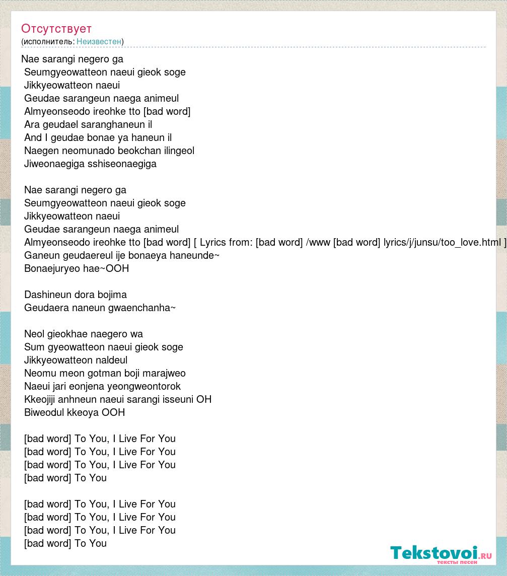Nae sarangi negero ga Seumgyeowatteon naeui gieok soge Jikkyeowatteon naeui Geudae sarangeun naega animeul Almyeonseodo ireohke tto [bad word] Ara geudael saranghaneun il And I geudae bonae ya haneun il Naegen neomunado beokchan ilingeol Jiweonaegiga sshiseonaegiga Nae sarangi negero ga Seumgyeowatteon naeui gieok soge Jikkyeowatteon naeui Geudae sarangeun naega animeul Almyeonseodo ireohke tto [bad word] [ Lyrics from: [bad word] /www [bad word] lyrics/j/junsu/too_love.html ] Ganeun geudaereul ije bonaeya haneunde~ Bonaejuryeo hae~OOH Dashineun dora bojima Geudaera naneun gwaenchanha~ Neol gieokhae naegero wa Sum gyeowatteon naeui gieok soge Jikkyeowatteon naldeul Neomu meon gotman boji marajweo Naeui jari eonjena yeongweontorok Kkeojiji anhneun naeui sarangi isseuni OH Biweodul kkeoya OOH [bad word] To You, I Live For You [bad word] To You, I Live For You [bad word] To You, I Live For You [bad word] To You [bad word] To You, I Live For You [bad word] To You, I Live For You [bad word] To You, I Live For You [bad word] To You