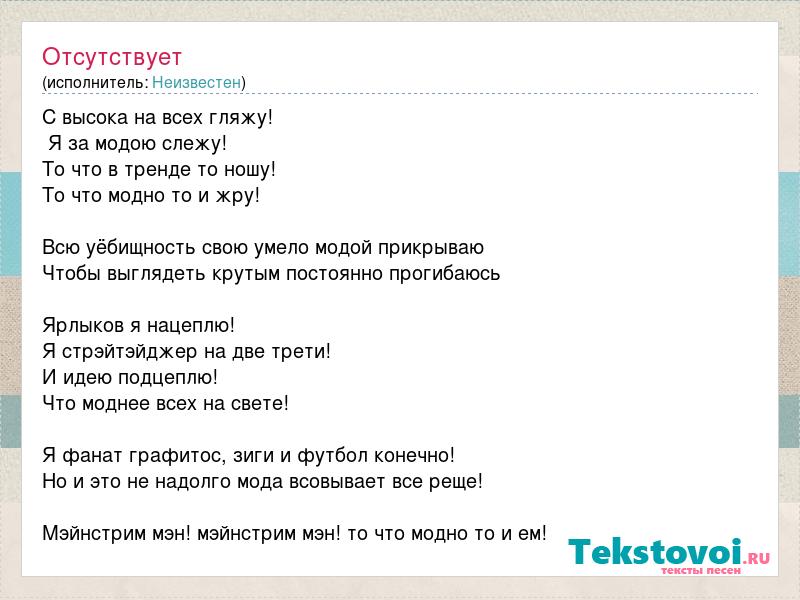 С высока на всех гляжу! Я за модою слежу! То что в тренде то ношу! То что модно то и жру! Всю уёбищность свою умело модой прикрываю Чтобы выглядеть крутым постоянно прогибаюсь Ярлыков я нацеплю! Я стрэйтэйджер на две трети! И идею подцеплю! Что моднее всех на свете! Я фанат графитос, зиги и футбол конечно! Но и это не надолго мода всовывает все реще! Мэйнстрим мэн! мэйнстрим мэн! то что модно то и ем!