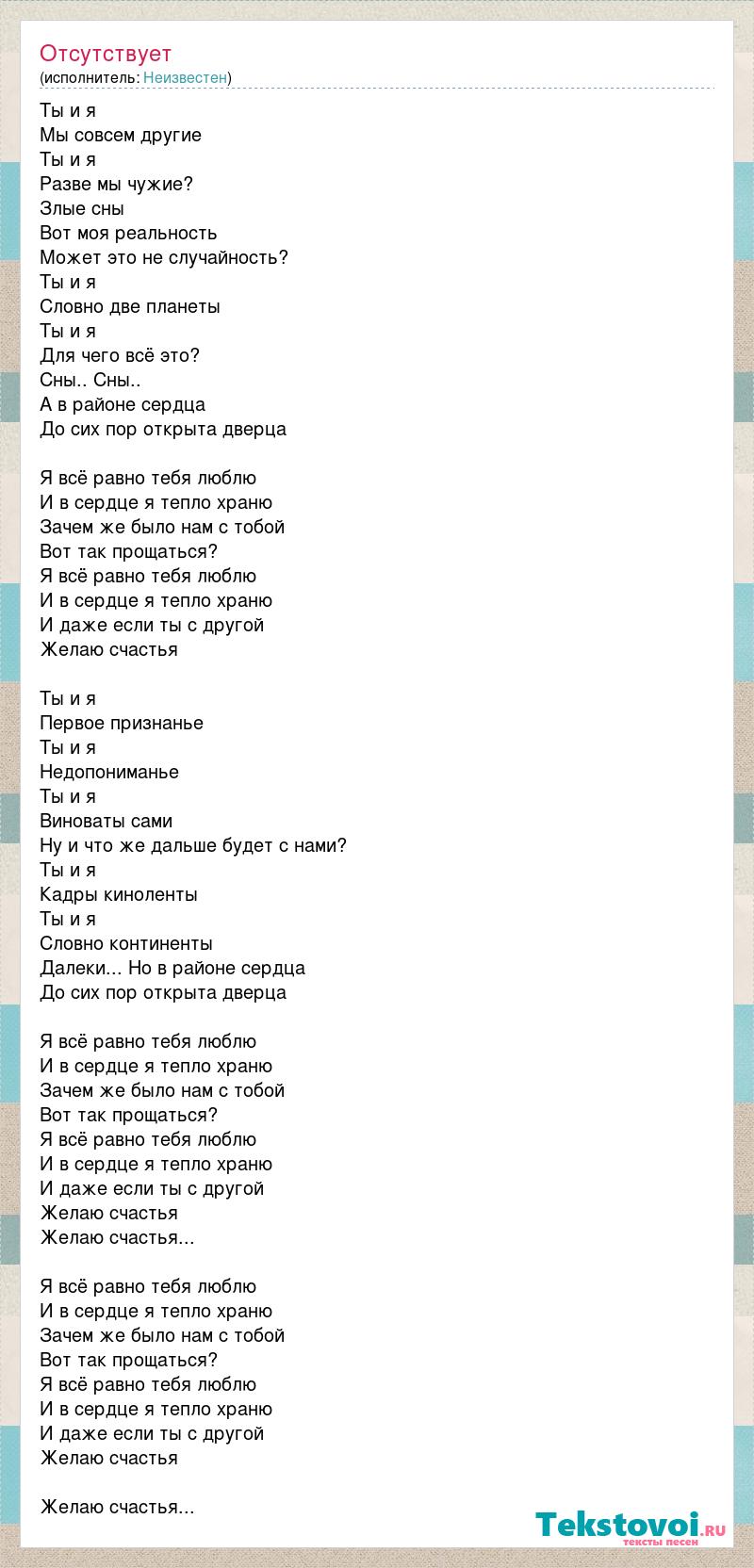 Ты и я Мы совсем другие Ты и я Разве мы чужие? Злые сны Вот моя реальность Может это не случайность? Ты и я Словно две планеты Ты и я Для чего всё это? Сны.. Сны.. А в районе сердца До сих пор открыта дверца Я всё равно тебя люблю И в сердце я тепло храню Зачем же было нам с тобой Вот так прощаться? Я всё равно тебя люблю И в сердце я тепло храню И даже если ты с другой Желаю счастья Ты и я Первое признанье Ты и я Недопониманье Ты и я Виноваты сами Ну и что же дальше будет с нами? Ты и я Кадры киноленты Ты и я Словно континенты Далеки... Но в районе сердца До сих пор открыта дверца Я всё равно тебя люблю И в сердце я тепло храню Зачем же было нам с тобой Вот так прощаться? Я всё равно тебя люблю И в сердце я тепло храню И даже если ты с другой Желаю счастья Желаю счастья... Я всё равно тебя люблю И в сердце я тепло храню Зачем же было нам с тобой Вот так прощаться? Я всё равно тебя люблю И в сердце я тепло храню И даже если ты с другой Желаю счастья Желаю счастья...