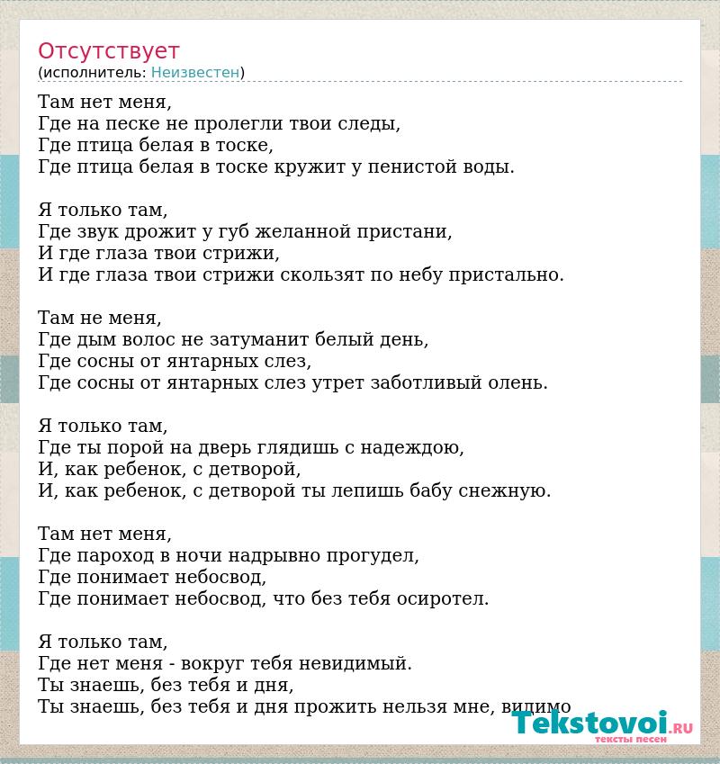 Там нет меня, Где на песке не пролегли твои следы, Где птица белая в тоске, Где птица белая в тоске кружит у пенистой воды. Я только там, Где звук дрожит у губ желанной пристани, И где глаза твои стрижи, И где глаза твои стрижи скользят по небу пристально. Там не меня, Где дым волос не затуманит белый день, Где сосны от янтарных слез, Где сосны от янтарных слез утрет заботливый олень. Я только там, Где ты порой на дверь глядишь с надеждою, И, как ребенок, с детворой, И, как ребенок, с детворой ты лепишь бабу снежную. Там нет меня, Где пароход в ночи надрывно прогудел, Где понимает небосвод, Где понимает небосвод, что без тебя осиротел. Я только там, Где нет меня - вокруг тебя невидимый. Ты знаешь, без тебя и дня, Ты знаешь, без тебя и дня прожить нельзя мне, видимо
