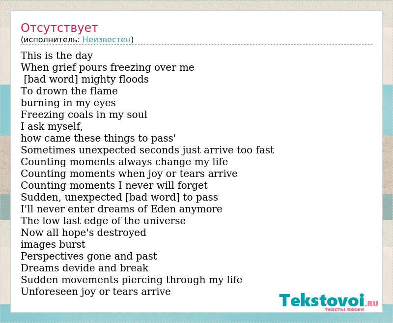 This is the day When grief pours freezing over me [bad word] mighty floods To drown the flame burning in my eyes Freezing coals in my soul I ask myself, how came these things to pass' Sometimes unexpected seconds just arrive too fast Counting moments always change my life Counting moments when joy or tears arrive Counting moments I never will forget Sudden, unexpected [bad word] to pass I'll never enter dreams of Eden anymore The low last edge of the universe Now all hope's destroyed images burst Perspectives gone and past Dreams devide and break Sudden movements piercing through my life Unforeseen joy or tears arrive