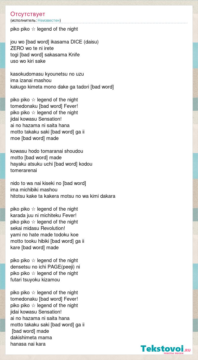 piko piko ☆ legend of the night jou wo [bad word] ikasama DICE (daisu) ZERO wo te ni irete togi [bad word] sakasama Knife uso wo kiri sake kasokudomasu kyounetsu no uzu ima izanai mashou kakugo kimeta mono dake ga tadori [bad word] piko piko ☆ legend of the night tomedonaku [bad word] Fever! piko piko ☆ legend of the night jidai kowasu Sensation! ai no hazama ni saita hana motto takaku saki [bad word] ga ii moe [bad word] made kowasu hodo tomaranai shoudou motto [bad word] made hayaku atsuku uchi [bad word] kodou tomerarenai nido to wa nai kiseki no [bad word] ima michibiki mashou hitotsu kake ta kakera motsu no wa kimi dakara piko piko ☆ legend of the night karada juu ni michiteku Fever! piko piko ☆ legend of the night sekai midasu Revolution! yami no hate made todoku koe motto tooku hibiki [bad word] ga ii kare [bad word] made piko piko ☆ legend of the night densetsu no ichi PAGE(peeji) ni piko piko ☆ legend of the night futari tsuyoku kizamou piko piko ☆ legend of the night tomedonaku [bad word] Fever! piko piko ☆ legend of the night jidai kowasu Sensation! ai no hazama ni saita hana motto takaku saki [bad word] ga ii [bad word] made dakishimeta mama hanasa nai kara