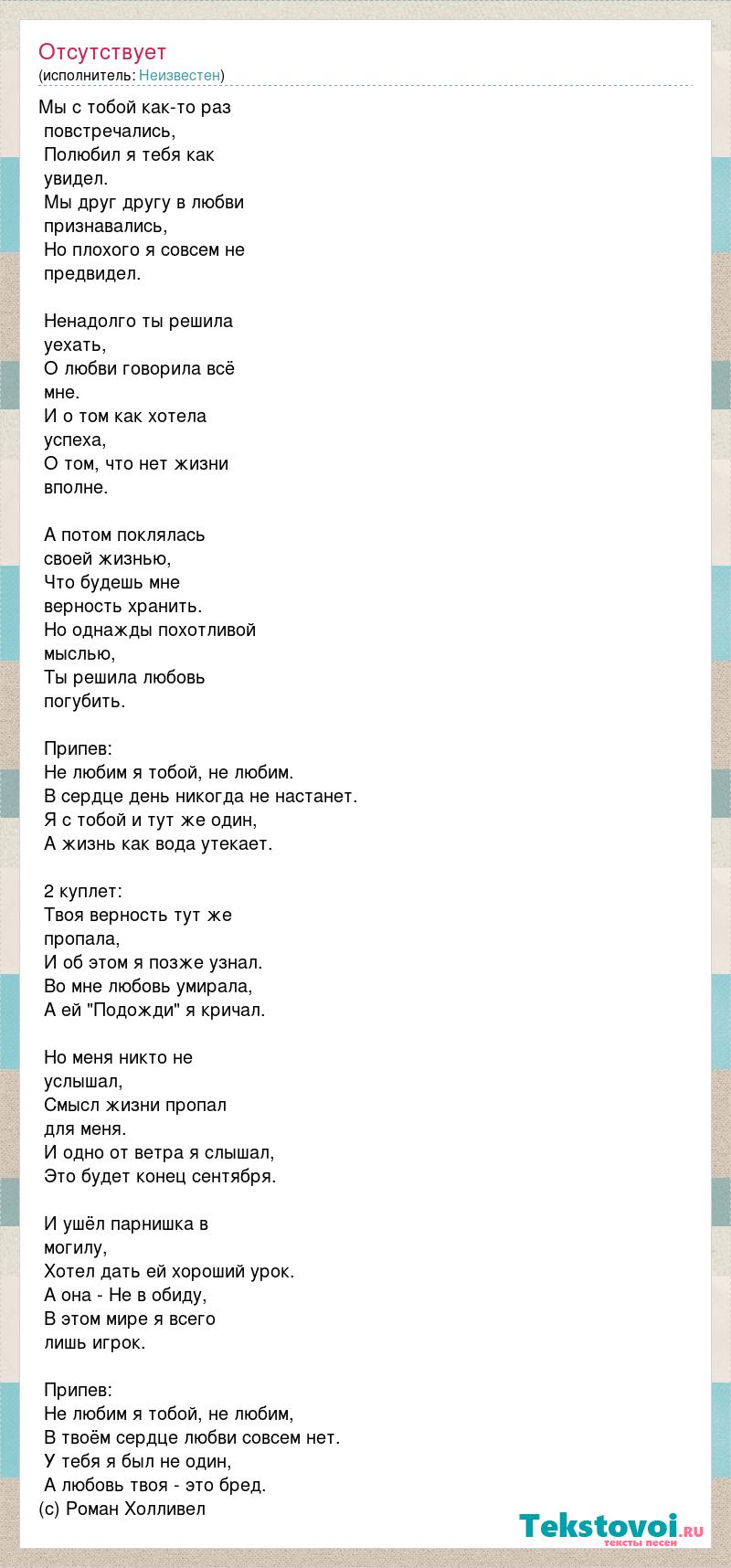 Мы с тобой как-то раз повстречались, Полюбил я тебя как увидел. Мы друг другу в любви признавались, Но плохого я совсем не предвидел. Ненадолго ты решила уехать, О любви говорила всё мне. И о том как хотела успеха, О том, что нет жизни вполне. А потом поклялась своей жизнью, Что будешь мне верность хранить. Но однажды похотливой мыслью, Ты решила любовь погубить. Припев: Не любим я тобой, не любим. В сердце день никогда не настанет. Я с тобой и тут же один, А жизнь как вода утекает. 2 куплет: Твоя верность тут же пропала, И об этом я позже узнал. Во мне любовь умирала, А ей "Подожди" я кричал. Но меня никто не услышал, Смысл жизни пропал для меня. И одно от ветра я слышал, Это будет конец сентября. И ушёл парнишка в могилу, Хотел дать ей хороший урок. А она - Не в обиду, В этом мире я всего лишь игрок. Припев: Не любим я тобой, не любим, В твоём сердце любви совсем нет. У тебя я был не один, А любовь твоя - это бред. (с) Роман Холливел