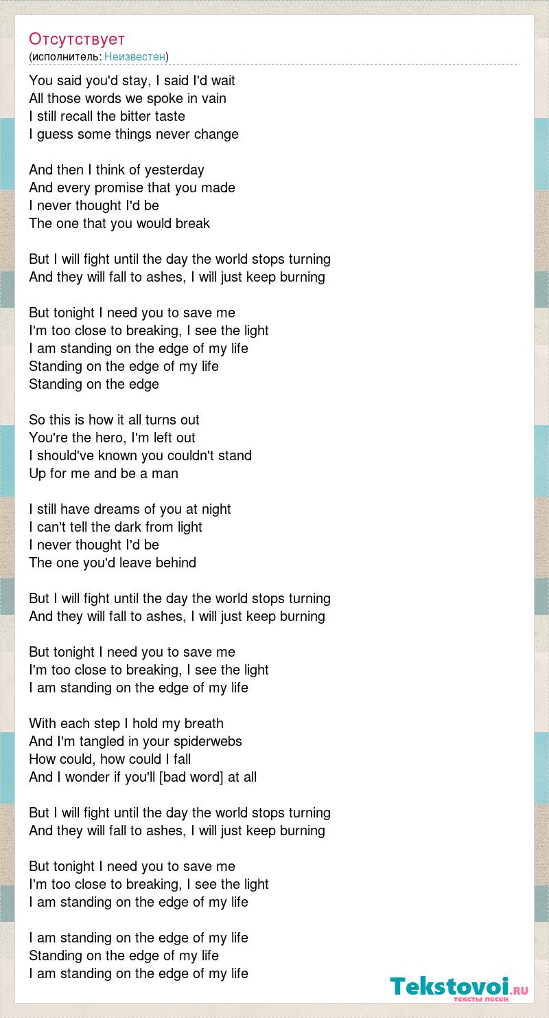 You said you'd stay, I said I'd wait All those words we spoke in vain I still recall the bitter taste I guess some things never change And then I think of yesterday And every promise that you made I never thought I'd be The one that you would break But I will fight until the day the world stops turning And they will fall to ashes, I will just keep burning But tonight I need you to save me I'm too close to breaking, I see the light I am standing on the edge of my life Standing on the edge of my life Standing on the edge So this is how it all turns out You're the hero, I'm left out I should've known you couldn't stand Up for me and be a man I still have dreams of you at night I can't tell the dark from light I never thought I'd be The one you'd leave behind But I will fight until the day the world stops turning And they will fall to ashes, I will just keep burning But tonight I need you to save me I'm too close to breaking, I see the light I am standing on the edge of my life With each step I hold my breath And I'm tangled in your spiderwebs How could, how could I fall And I wonder if you'll [bad word] at all But I will fight until the day the world stops turning And they will fall to ashes, I will just keep burning But tonight I need you to save me I'm too close to breaking, I see the light I am standing on the edge of my life I am standing on the edge of my life Standing on the edge of my life I am standing on the edge of my life