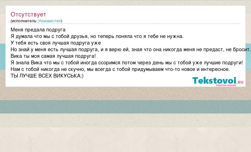 Меня предала подруга Я думала что мы с тобой друзья, но теперь поняла что я тебе не нужна. У тебя есть своя лучшая подруга уже Но знай у меня есть лучшая подруга, и я верю ей, зная что она никогда меня не предаст, не бросит. Вика ты моя самая лучшая подруга! Я знала Вика что мы с тобой иногда ссоримся потом через день мы с тобой уже лучшие подруги! Нам с тобой никогда не скучно, мы всегда с тобой придумываем что-то новое и интересное. ТЫ ЛУЧШЕ ВСЕХ ВИКУСЬКА:)