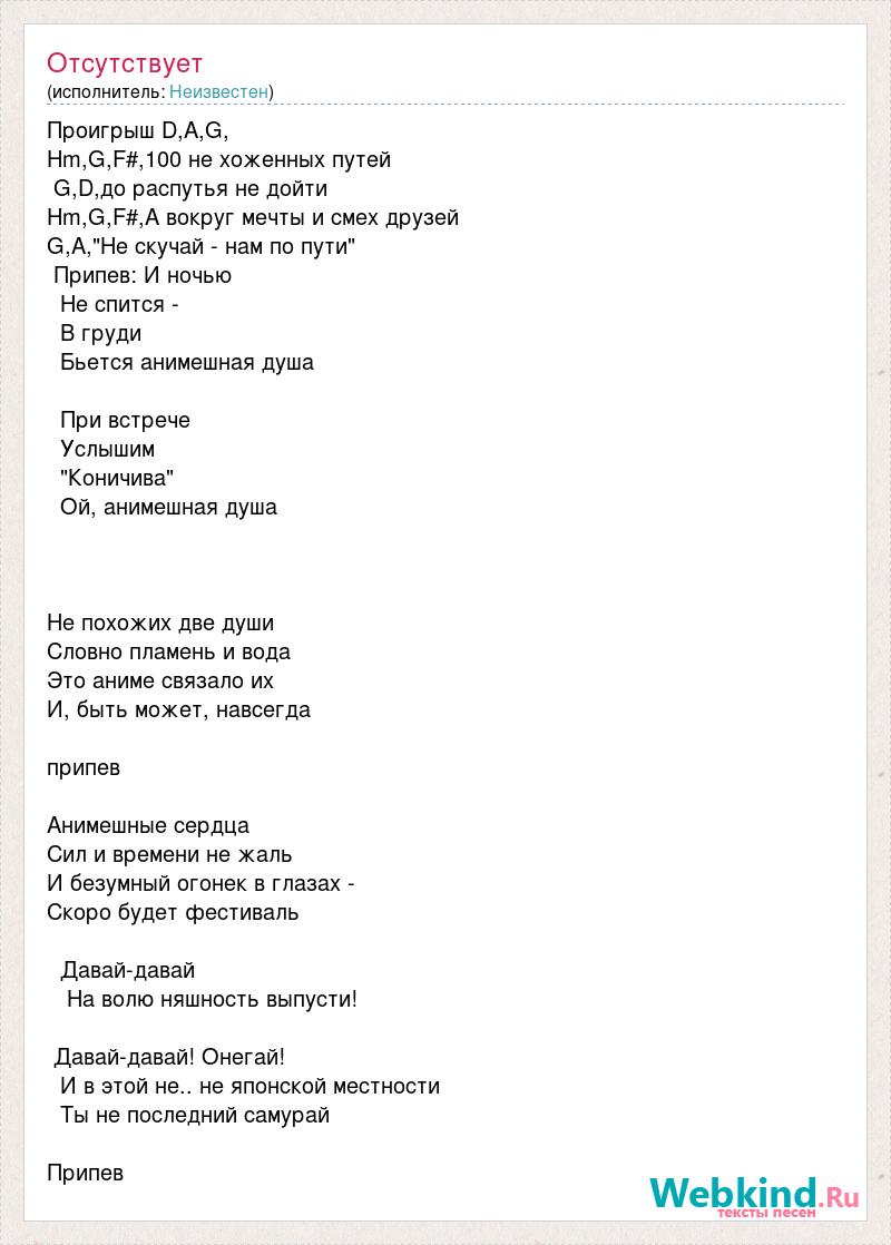 Проигрыш D,A,G, Hm,G,F#,100 не хоженных путей G,D,до распутья не дойти Hm,G,F#,А вокруг мечты и смех друзей G,A,"Не скучай - нам по пути" Припев: И ночью Не спится - В груди Бьется анимешная душа При встрече Услышим "Коничива" Ой, анимешная душа Не похожих две души Словно пламень и вода Это аниме связало их И, быть может, навсегда припев Анимешные сердца Сил и времени не жаль И безумный огонек в глазах - Скоро будет фестиваль Давай-давай На волю няшность выпусти! Давай-давай! Онегай! И в этой не.. не японской местности Ты не последний самурай Припев