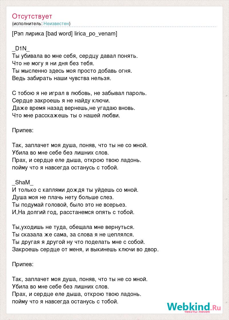 [Рэп лирика [bad word] lirica_po_venam] _D1N_ Ты убивала во мне себя, сердцу давал понять. Что не могу я ни дня без тебя. Ты мысленно здесь моя просто добавь огня. Ведь забирать наши чувства нельзя. С тобою я не играл в любовь, не забывал пароль. Сердце закроешь я не найду ключи. Даже время назад вернешь,не угадаю вновь. Что мне расскажешь ты о нашей любви. Припев: Так, заплачет моя душа, поняв, что ты не со мной. Убила во мне себе без лишних слов. Прах, и сердце еле дыша, открою твою ладонь. пойму что я навсегда останусь с тобой. _ShaM_ И только с каплями дождя ты уйдешь со мной. Душа моя не плачь нету больше слез. Ты подумай головой, было это не всерьез. И,На долгий год, расстанемся опять с тобой. Ты,уходишь не туда, обещала мне вернуться. Ты сказала же сама, за слова я не цеплялся. Ты другая я другой ну что поделать мне с собой. Закроешь сердце от меня, и выкинешь ключи во двор. Припев: Так, заплачет моя душа, поняв, что ты не со мной. Убила во мне себе без лишних слов. Прах, и сердце еле дыша, открою твою ладонь. пойму что я навсегда останусь с тобой.