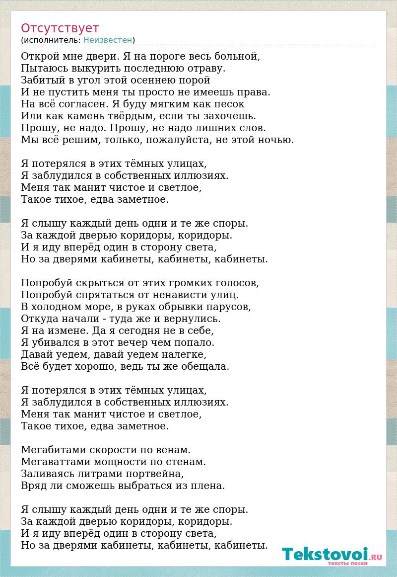 Открой мне двери. Я на пороге весь больной, Пытаюсь выкурить последнюю отраву. Забитый в угол этой осеннею порой И не пустить меня ты просто не имеешь права. На всё согласен. Я буду мягким как песок Или как камень твёрдым, если ты захочешь. Прошу, не надо. Прошу, не надо лишних слов. Мы всё решим, только, пожалуйста, не этой ночью. Я потерялся в этих тёмных улицах, Я заблудился в собственных иллюзиях. Меня так манит чистое и светлое, Такое тихое, едва заметное. Я слышу каждый день одни и те же споры. За каждой дверью коридоры, коридоры. И я иду вперёд один в сторону света, Но за дверями кабинеты, кабинеты, кабинеты. Попробуй скрыться от этих громких голосов, Попробуй спрятаться от ненависти улиц. В холодном море, в руках обрывки парусов, Откуда начали - туда же и вернулись. Я на измене. Да я сегодня не в себе, Я убивался в этот вечер чем попало. Давай уедем, давай уедем налегке, Всё будет хорошо, ведь ты же обещала. Я потерялся в этих тёмных улицах, Я заблудился в собственных иллюзиях. Меня так манит чистое и светлое, Такое тихое, едва заметное. Мегабитами скорости по венам. Мегаваттами мощности по стенам. Заливаясь литрами портвейна, Вряд ли сможешь выбраться из плена. Я слышу каждый день одни и те же споры. За каждой дверью коридоры, коридоры. И я иду вперёд один в сторону света, Но за дверями кабинеты, кабинеты, кабинеты.