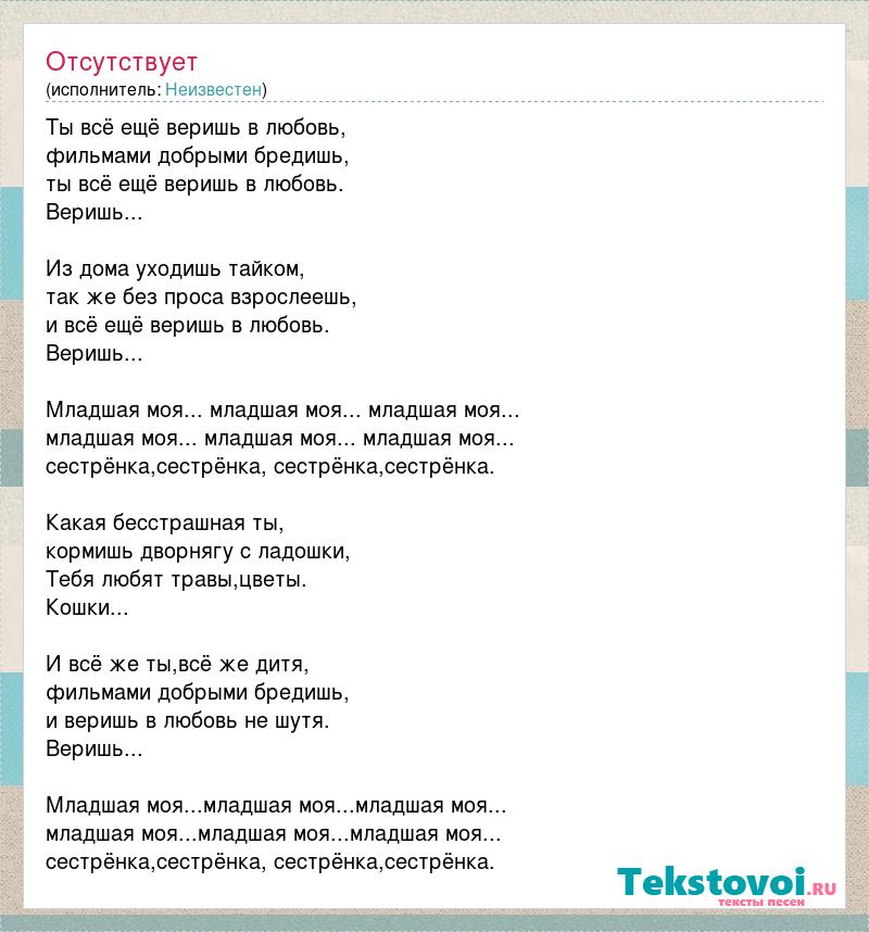 Ты всё ещё веришь в любовь, фильмами добрыми бредишь, ты всё ещё веришь в любовь. Веришь... Из дома уходишь тайком, так же без проса взрослеешь, и всё ещё веришь в любовь. Веришь... Младшая моя... младшая моя... младшая моя... младшая моя... младшая моя... младшая моя... сестрёнка,сестрёнка, сестрёнка,сестрёнка. Какая бесстрашная ты, кормишь дворнягу с ладошки, Тебя любят травы,цветы. Кошки... И всё же ты,всё же дитя, фильмами добрыми бредишь, и веришь в любовь не шутя. Веришь... Младшая моя...младшая моя...младшая моя... младшая моя...младшая моя...младшая моя... сестрёнка,сестрёнка, сестрёнка,сестрёнка.