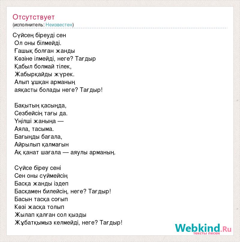 Сүйсең біреуді сен Ол оны білмейді. Ғашық болған жанды Көзіне ілмейді, неге? Тағдыр Қабыл болмай тілек, Жабырқайды жүрек. Алып ұшқан арманың аяқасты болады неге? Тағдыр! Бақытың қасыңда, Сезбейсің тағы да. Үңілші жаныңа — Аяла, тасыма. Бағыңды бағала, Айрылып қалмағын Ақ қанат шағала — аяулы арманың. Сүйсе біреу сені Сен оны сүймейсің Басқа жанды іздеп Басқамен билейсің, неге? Тағдыр! Басын тасқа соғып Көзі жасқа толып Жылап қалған сол қызды Жұбатқымыз келмейді, неге? Тағдыр!