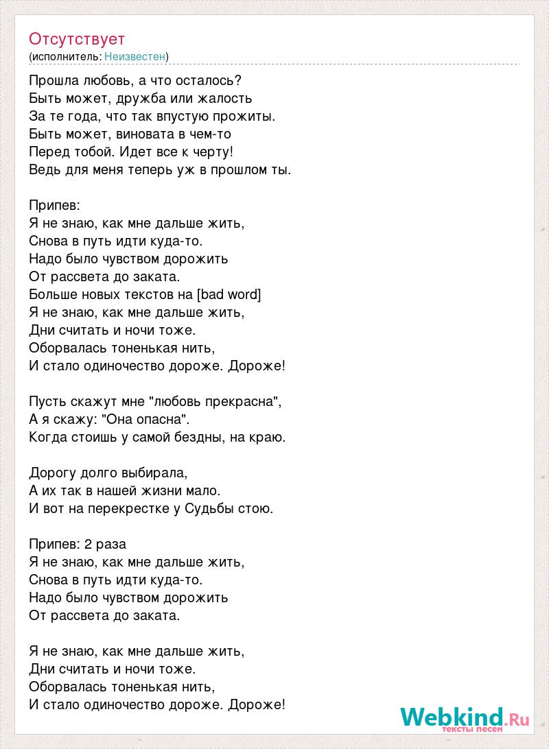 Прошла любовь, а что осталось? Быть может, дружба или жалость За те года, что так впустую прожиты. Быть может, виновата в чем-то Перед тобой. Идет все к черту! Ведь для меня теперь уж в прошлом ты. Припев: Я не знаю, как мне дальше жить, Снова в путь идти куда-то. Надо было чувством дорожить От рассвета до заката. Больше новых текстов на [bad word] Я не знаю, как мне дальше жить, Дни считать и ночи тоже. Оборвалась тоненькая нить, И стало одиночество дороже. Дороже! Пусть скажут мне "любовь прекрасна", А я скажу: "Она опасна". Когда стоишь у самой бездны, на краю. Дорогу долго выбирала, А их так в нашей жизни мало. И вот на перекрестке у Судьбы стою. Припев: 2 раза Я не знаю, как мне дальше жить, Снова в путь идти куда-то. Надо было чувством дорожить От рассвета до заката. Я не знаю, как мне дальше жить, Дни считать и ночи тоже. Оборвалась тоненькая нить, И стало одиночество дороже. Дороже!