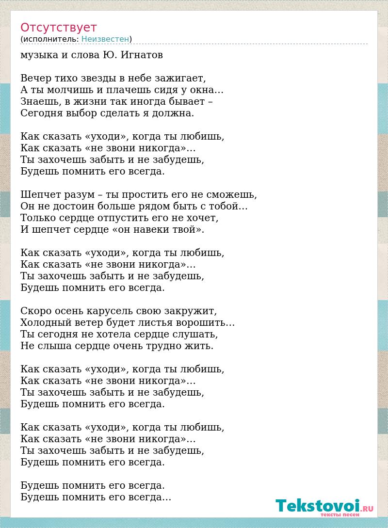 музыка и слова Ю. Игнатов Вечер тихо звезды в небе зажигает, А ты молчишь и плачешь сидя у окна… Знаешь, в жизни так иногда бывает – Сегодня выбор сделать я должна. Как сказать «уходи», когда ты любишь, Как сказать «не звони никогда»… Ты захочешь забыть и не забудешь, Будешь помнить его всегда. Шепчет разум – ты простить его не сможешь, Он не достоин больше рядом быть с тобой… Только сердце отпустить его не хочет, И шепчет сердце «он навеки твой». Как сказать «уходи», когда ты любишь, Как сказать «не звони никогда»… Ты захочешь забыть и не забудешь, Будешь помнить его всегда. Скоро осень карусель свою закружит, Холодный ветер будет листья ворошить… Ты сегодня не хотела сердце слушать, Не слыша сердце очень трудно жить. Как сказать «уходи», когда ты любишь, Как сказать «не звони никогда»… Ты захочешь забыть и не забудешь, Будешь помнить его всегда. Как сказать «уходи», когда ты любишь, Как сказать «не звони никогда»… Ты захочешь забыть и не забудешь, Будешь помнить его всегда. Будешь помнить его всегда. Будешь помнить его всегда…