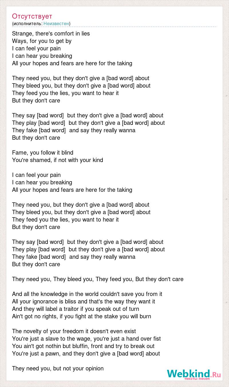 Strange, [bad word] in lies Ways, for you to get by I can feel your pain I can hear you breaking All your hopes and fears are here for the taking They need you, but they don't give a [bad word] about They bleed you, but they don't give a [bad word] about They feed you the lies, you want to hear it But they don't care They say [bad word] but they don't give a [bad word] about They play [bad word] but they don't give a [bad word] about They fake [bad word] and say they really wanna But they don't care Fame, you follow it blind You're shamed, if not with your kind I can feel your pain I can hear you breaking All your hopes and fears are here for the taking They need you, but they don't give a [bad word] about They bleed you, but they don't give a [bad word] about They feed you the lies, you want to hear it But they don't care They say [bad word] but they don't give a [bad word] about They play [bad word] but they don't give a [bad word] about They fake [bad word] and say they really wanna But they don't care They need you, They bleed you, They feed you, But they don't care And all the knowledge in the world couldn't save you from it All your ignorance is bliss and that's the way they want it And they will label a traitor if you speak out of turn Ain't got no rights, if you fight at the stake you will burn The novelty of your freedom it doesn't even exist You're just a slave to the wage, you're just a hand over fist You ain't got nothin but bluffin, front and try to break out You're just a pawn, and they don't give a [bad word] about They need you, but not your opinion