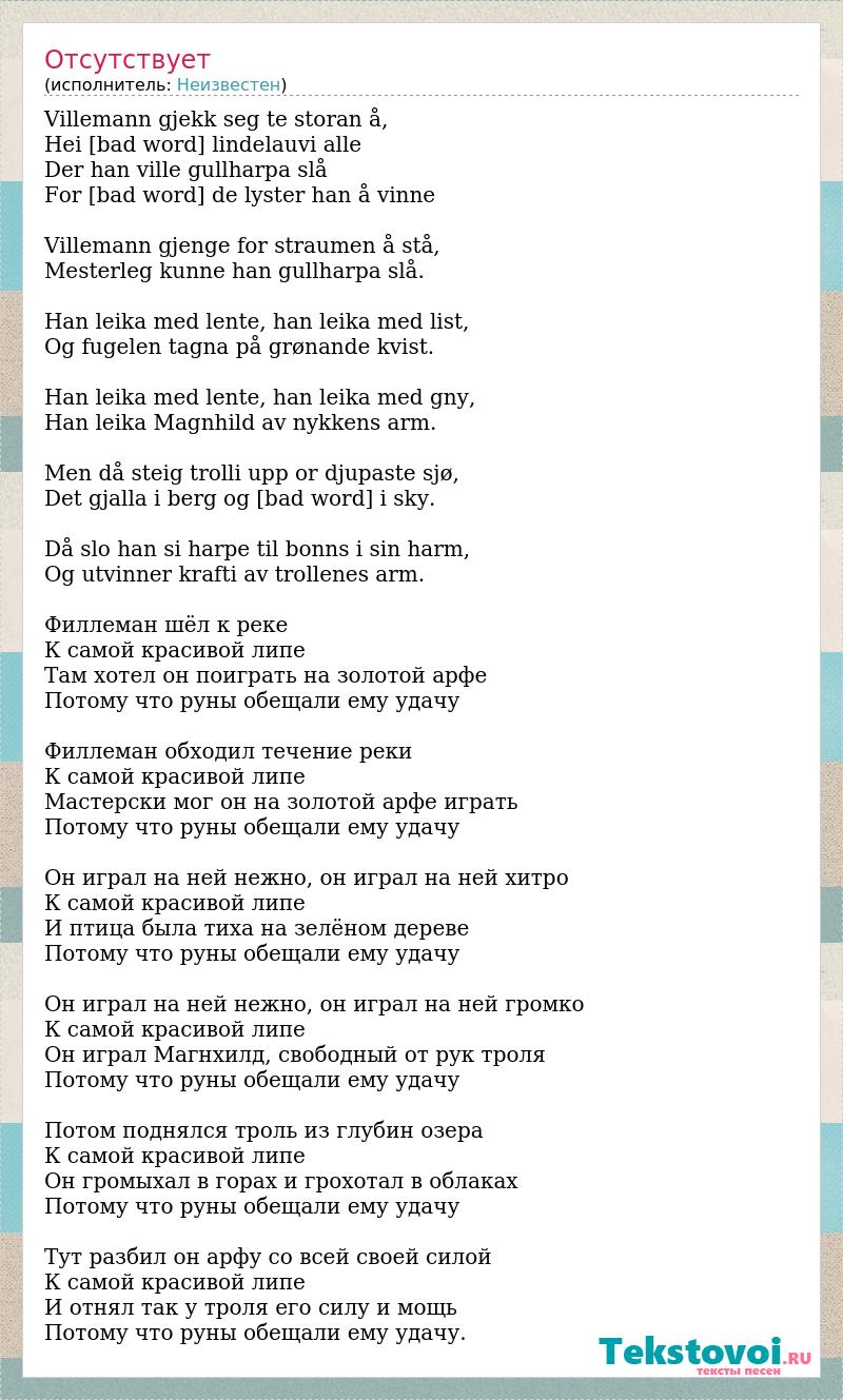 Villemann gjekk seg te storan å, Hei [bad word] lindelauvi alle Der han ville gullharpa slå For [bad word] de lyster han å vinne Villemann gjenge for straumen å stå, Mesterleg kunne han gullharpa slå. Han leika med lente, han leika med list, Og fugelen tagna på grønande kvist. Han leika med lente, han leika med gny, Han leika Magnhild av nykkens arm. Men då steig trolli upp or djupaste sjø, Det gjalla i berg og [bad word] i sky. Då slo han si harpe til bonns i sin harm, Og utvinner krafti av trollenes arm. Филлеман шёл к реке К самой красивой липе Там хотел он поиграть на золотой арфе Потому что руны обещали ему удачу Филлеман обходил течение реки К самой красивой липе Мастерски мог он на золотой арфе играть Потому что руны обещали ему удачу Он играл на ней нежно, он играл на ней хитро К самой красивой липе И птица была тиха на зелёном дереве Потому что руны обещали ему удачу Он играл на ней нежно, он играл на ней громко К самой красивой липе Он играл Магнхилд, свободный от рук троля Потому что руны обещали ему удачу Потом поднялся троль из глубин озера К самой красивой липе Он громыхал в горах и грохотал в облаках Потому что руны обещали ему удачу Тут разбил он арфу со всей своей силой К самой красивой липе И отнял так у троля его силу и мощь Потому что руны обещали ему удачу.