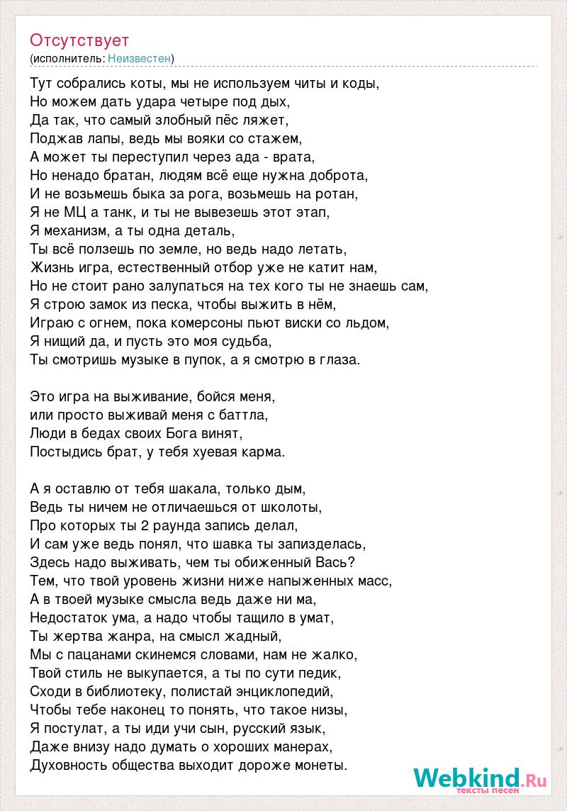 Тут собрались коты, мы не используем читы и коды, Но можем дать удара четыре под дых, Да так, что самый злобный пёс ляжет, Поджав лапы, ведь мы вояки со стажем, А может ты переступил через ада - врата, Но ненадо братан, людям всё еще нужна доброта, И не возьмешь быка за рога, возьмешь на ротан, Я не МЦ а танк, и ты не вывезешь этот этап, Я механизм, а ты одна деталь, Ты всё ползешь по земле, но ведь надо летать, Жизнь игра, естественный отбор уже не катит нам, Но не стоит рано залупаться на тех кого ты не знаешь сам, Я строю замок из песка, чтобы выжить в нём, Играю с огнем, пока комерсоны пьют виски со льдом, Я нищий да, и пусть это моя судьба, Ты смотришь музыке в пупок, а я смотрю в глаза. Это игра на выживание, бойся меня, или просто выживай меня с баттла, Люди в бедах своих Бога винят, Постыдись брат, у тебя хуевая карма. А я оставлю от тебя шакала, только дым, Ведь ты ничем не отличаешься от школоты, Про которых ты 2 раунда запись делал, И сам уже ведь понял, что шавка ты запизделась, Здесь надо выживать, чем ты обиженный Вась? Тем, что твой уровень жизни ниже напыженных масс, А в твоей музыке смысла ведь даже ни ма, Недостаток ума, а надо чтобы тащило в умат, Ты жертва жанра, на смысл жадный, Мы с пацанами скинемся словами, нам не жалко, Твой стиль не выкупается, а ты по сути педик, Сходи в библиотеку, полистай энциклопедий, Чтобы тебе наконец то понять, что такое низы, Я постулат, а ты иди учи сын, русский язык, Даже внизу надо думать о хороших манерах, Духовность общества выходит дороже монеты.