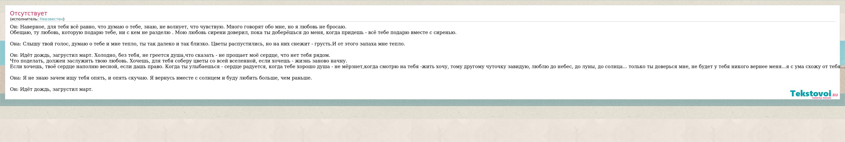 Он: Идёт дождь, загрустил март. Холодно, без тебя, не греется душа,что сказать - не прощает моё сердце, что нет тебя рядом.