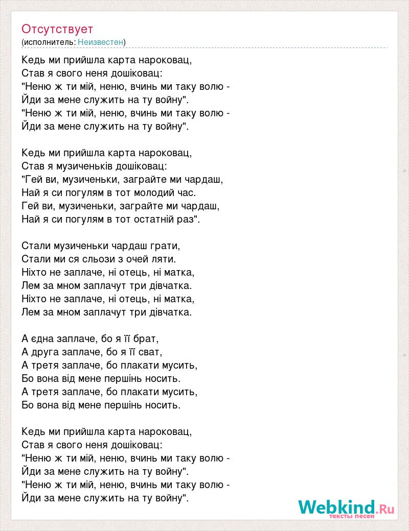 Кедь ми прийшла карта нароковац, Став я свого неня дошіковац: "Неню ж ти мій, неню, вчинь ми таку волю - Йди за мене служить на ту войну". "Неню ж ти мій, неню, вчинь ми таку волю - Йди за мене служить на ту войну". Кедь ми прийшла карта нароковац, Став я музиченьків дошіковац: "Гей ви, музиченьки, заграйте ми чардаш, Най я си погулям в тот молодий час. Гей ви, музиченьки, заграйте ми чардаш, Най я си погулям в тот остатній раз". Стали музиченьки чардаш грати, Стали ми ся сльози з очей ляти. Ніхто не заплаче, ні отець, ні матка, Лем за мном заплачут три дівчатка. Ніхто не заплаче, ні отець, ні матка, Лем за мном заплачут три дівчатка. А єдна заплаче, бо я її брат, А друга заплаче, бо я її сват, А третя заплаче, бо плакати мусить, Бо вона від мене першінь носить. А третя заплаче, бо плакати мусить, Бо вона від мене першінь носить. Кедь ми прийшла карта нароковац, Став я свого неня дошіковац: "Неню ж ти мій, неню, вчинь ми таку волю - Йди за мене служить на ту войну". "Неню ж ти мій, неню, вчинь ми таку волю - Йди за мене служить на ту войну".