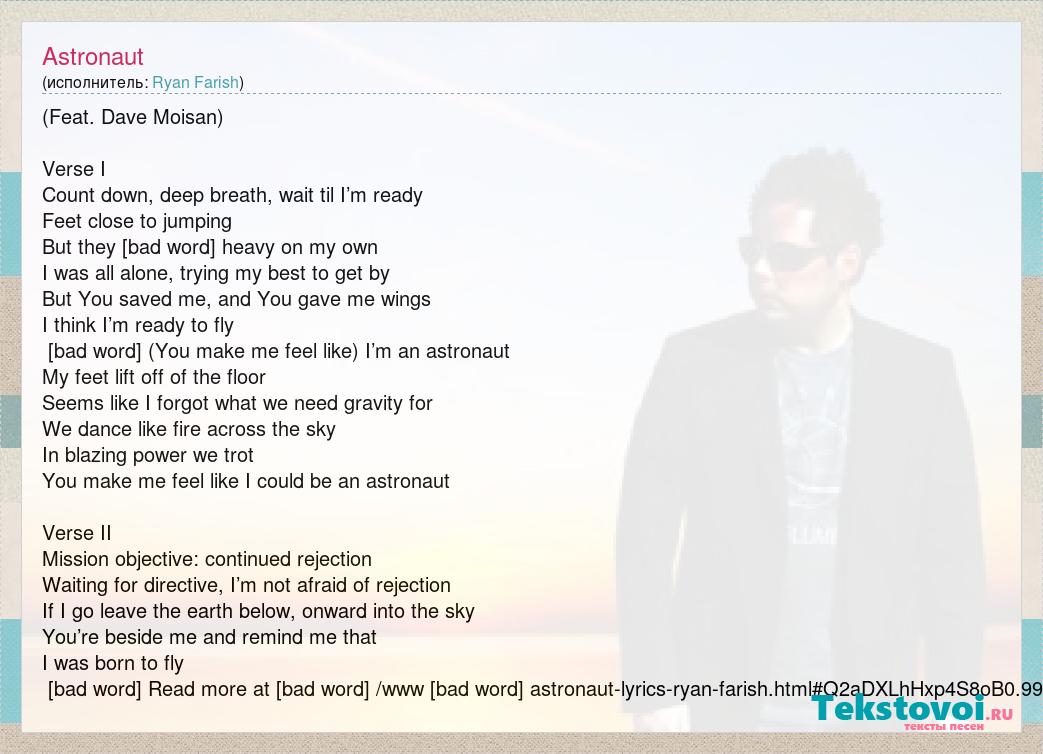(Feat. Dave Moisan) Verse I Count down, deep breath, wait til I’m ready Feet close to jumping But they [bad word] heavy on my own I was all alone, trying my best to get by But You saved me, and You gave me wings I think I’m ready to fly [bad word] (You make me feel like) I’m an astronaut My feet lift off of the floor Seems like I forgot what we need gravity for We dance like fire across the sky In blazing power we trot You make me feel like I could be an astronaut Verse II Mission objective: continued rejection Waiting for directive, I’m not afraid of rejection If I go leave the earth below, onward into the sky You’re beside me and remind me that I was born to fly [bad word] Read more at [bad word] /www [bad word] astronaut-lyrics-ryan-farish.html#Q2aDXLhHxp4S8oB0.99