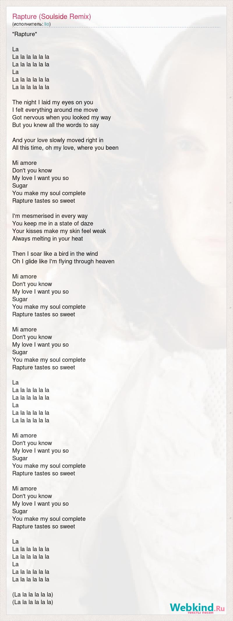 "Rapture" La La la la la la la La la la la la la La La la la la la la La la la la la la The night I laid my eyes on you I felt everything around me move Got nervous when you looked my way But you knew all the words to say And your love slowly moved right in All this time, oh my love, where you been Mi amore Don't you know My love I want you so Sugar You make my [bad word] Rapture tastes so sweet I'm mesmerised in every way You keep me in a state of daze Your kisses make my skin feel weak Always melting in your heat Then I soar like a bird in the wind Oh I glide like I'm flying through heaven Mi amore Don't you know My love I want you so Sugar You make my [bad word] Rapture tastes so sweet Mi amore Don't you know My love I want you so Sugar You make my [bad word] Rapture tastes so sweet La La la la la la la La la la la la la La La la la la la la La la la la la la Mi amore Don't you know My love I want you so Sugar You make my [bad word] Rapture tastes so sweet Mi amore Don't you know My love I want you so Sugar You make my [bad word] Rapture tastes so sweet La La la la la la la La la la la la la La La la la la la la La la la la la la (La la la la la la) (La la la la la la)