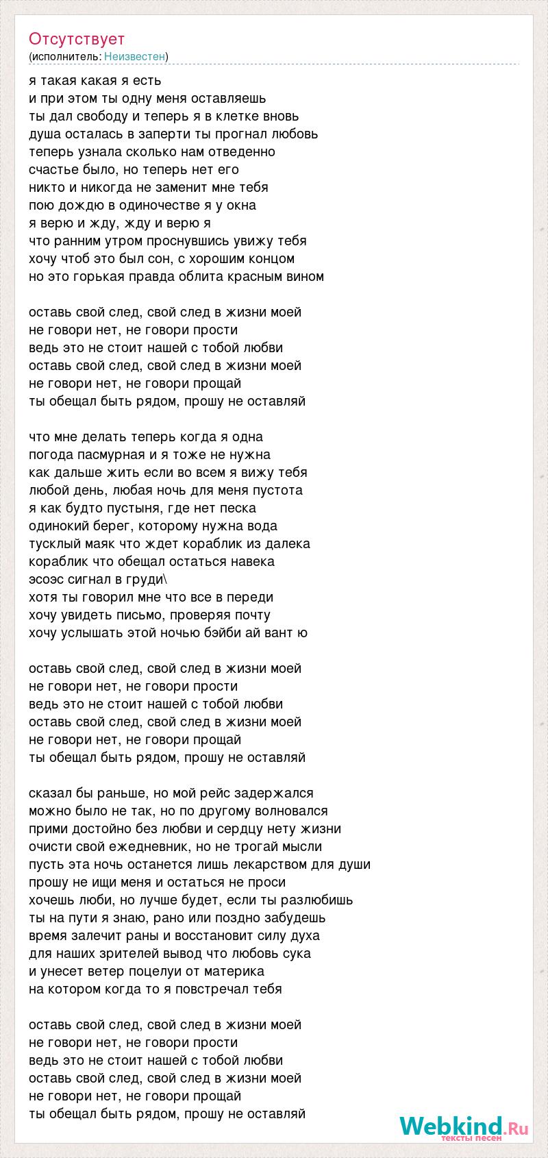 я такая какая я есть и при этом ты одну меня оставляешь ты дал свободу и теперь я в клетке вновь душа осталась в заперти ты прогнал любовь теперь узнала сколько нам отведенно счастье было, но теперь нет его никто и никогда не заменит мне тебя пою дождю в одиночестве я у окна я верю и жду, жду и верю я что ранним утром проснувшись увижу тебя хочу чтоб это был сон, с хорошим концом но это горькая правда облита красным вином оставь свой след, свой след в жизни моей не говори нет, не говори прости ведь это не стоит нашей с тобой любви оставь свой след, свой след в жизни моей не говори нет, не говори прощай ты обещал быть рядом, прошу не оставляй что мне делать теперь когда я одна погода пасмурная и я тоже не нужна как дальше жить если во всем я вижу тебя любой день, любая ночь для меня пустота я как будто пустыня, где нет песка одинокий берег, которому нужна вода тусклый маяк что ждет кораблик из далека кораблик что обещал остаться навека эсоэс сигнал в груди\ хотя ты говорил мне что все в переди хочу увидеть письмо, проверяя почту хочу услышать этой ночью бэйби ай вант ю оставь свой след, свой след в жизни моей не говори нет, не говори прости ведь это не стоит нашей с тобой любви оставь свой след, свой след в жизни моей не говори нет, не говори прощай ты обещал быть рядом, прошу не оставляй сказал бы раньше, но мой рейс задержался можно было не так, но по другому волновался прими достойно без любви и сердцу нету жизни очисти свой ежедневник, но не трогай мысли пусть эта ночь останется лишь лекарством для души прошу не ищи меня и остаться не проси хочешь люби, но лучше будет, если ты разлюбишь ты на пути я знаю, рано или поздно забудешь время залечит раны и восстановит силу духа для наших зрителей вывод что любовь сука и унесет ветер поцелуи от материка на котором когда то я повстречал тебя оставь свой след, свой след в жизни моей не говори нет, не говори прости ведь это не стоит нашей с тобой любви оставь свой след, свой след в жизни моей не говори нет, не говори прощай ты обещал быть рядом, прошу не оставляй