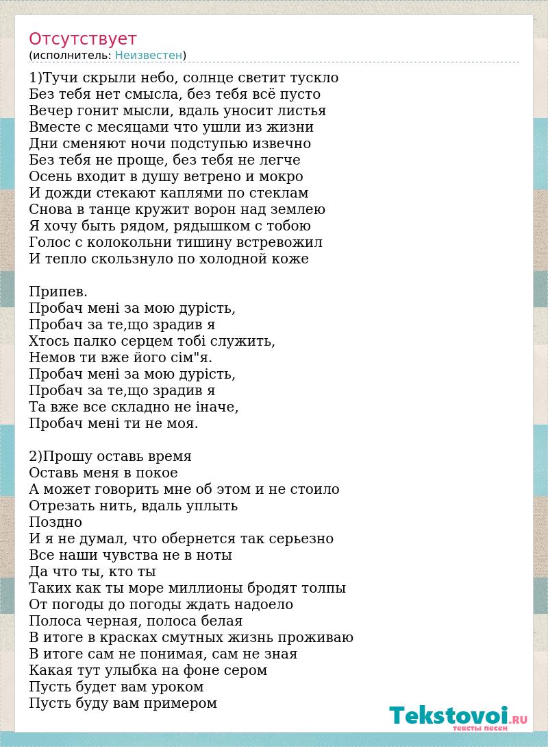 1)Тучи скрыли небо, солнце светит тускло Без тебя нет смысла, без тебя всё пусто Вечер гонит мысли, вдаль уносит листья Вместе с месяцами что ушли из жизни Дни сменяют ночи подступью извечно Без тебя не проще, без тебя не легче Осень входит в душу ветрено и мокро И дожди стекают каплями по стеклам Снова в танце кружит ворон над землею Я хочу быть рядом, рядышком с тобою Голос с колокольни тишину встревожил И тепло скользнуло по холодной коже Припев. Пробач мені за мою дурість, Пробач за те,що зрадив я Хтось палко серцем тобі служить, Немов ти вже його сім"я. Пробач мені за мою дурість, Пробач за те,що зрадив я Та вже все складно не іначе, Пробач мені ти не моя. 2)Прошу оставь время Оставь меня в покое А может говорить мне об этом и не стоило Отрезать нить, вдаль уплыть Поздно И я не думал, что обернется так серьезно Все наши чувства не в ноты Да что ты, кто ты Таких как ты море миллионы бродят толпы От погоды до погоды ждать надоело Полоса черная, полоса белая В итоге в красках смутных жизнь проживаю В итоге сам не понимая, сам не зная Какая тут улыбка на фоне сером Пусть будет вам уроком Пусть буду вам примером