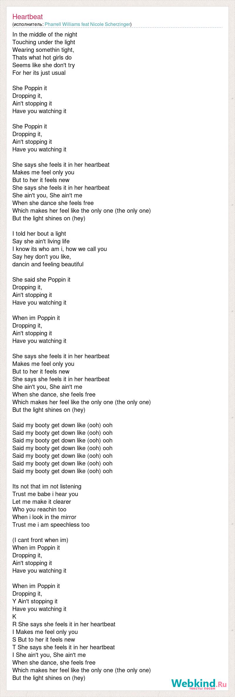 In the middle of the night Touching under the light Wearing somethin tight, Thats what hot girls do Seems like she don't try For her its just usual She Poppin it Dropping it, Ain't stopping it Have you watching it She Poppin it Dropping it, Ain't stopping it Have you watching it She says she feels it in her heartbeat Makes me feel only you But to her it feels new She says she feels it in her heartbeat She ain't you, She ain't me When she dance she feels free Which makes her feel like the only one (the only one) But the light shines on (hey) I told her bout a light Say she ain't living life I know its who am i, how we call you Say hey don't you like, dancin and feeling beautiful She said she Poppin it Dropping it, Ain't stopping it Have you watching it When im Poppin it Dropping it, Ain't stopping it Have you watching it She says she feels it in her heartbeat Makes me feel only you But to her it feels new She says she feels it in her heartbeat She ain't you, She ain't me When she dance, she feels free Which makes her feel like the only one (the only one) But the light shines on (hey) Said my booty get down like (ooh) ooh Said my booty get down like (ooh) ooh Said my booty get down like (ooh) ooh Said my booty get down like (ooh) ooh Said my booty get down like (ooh) ooh Said my booty get down like (ooh) ooh Said my booty get down like (ooh) ooh Its not that im not listening [bad word] me babe i hear you Let me make it clearer Who you reachin too When i look in the mirror [bad word] me i am speechless too (I cant front when im) When im Poppin it Dropping it, Ain't stopping it Have you watching it When im Poppin it Dropping it, Y Ain't stopping it Have you watching it K R She says she feels it in her heartbeat I Makes me feel only you S But to her it feels new T She says she feels it in her heartbeat I She ain't you, She ain't me When she dance, she feels free Which makes her feel like the only one (the only one) But the light shines on (hey)