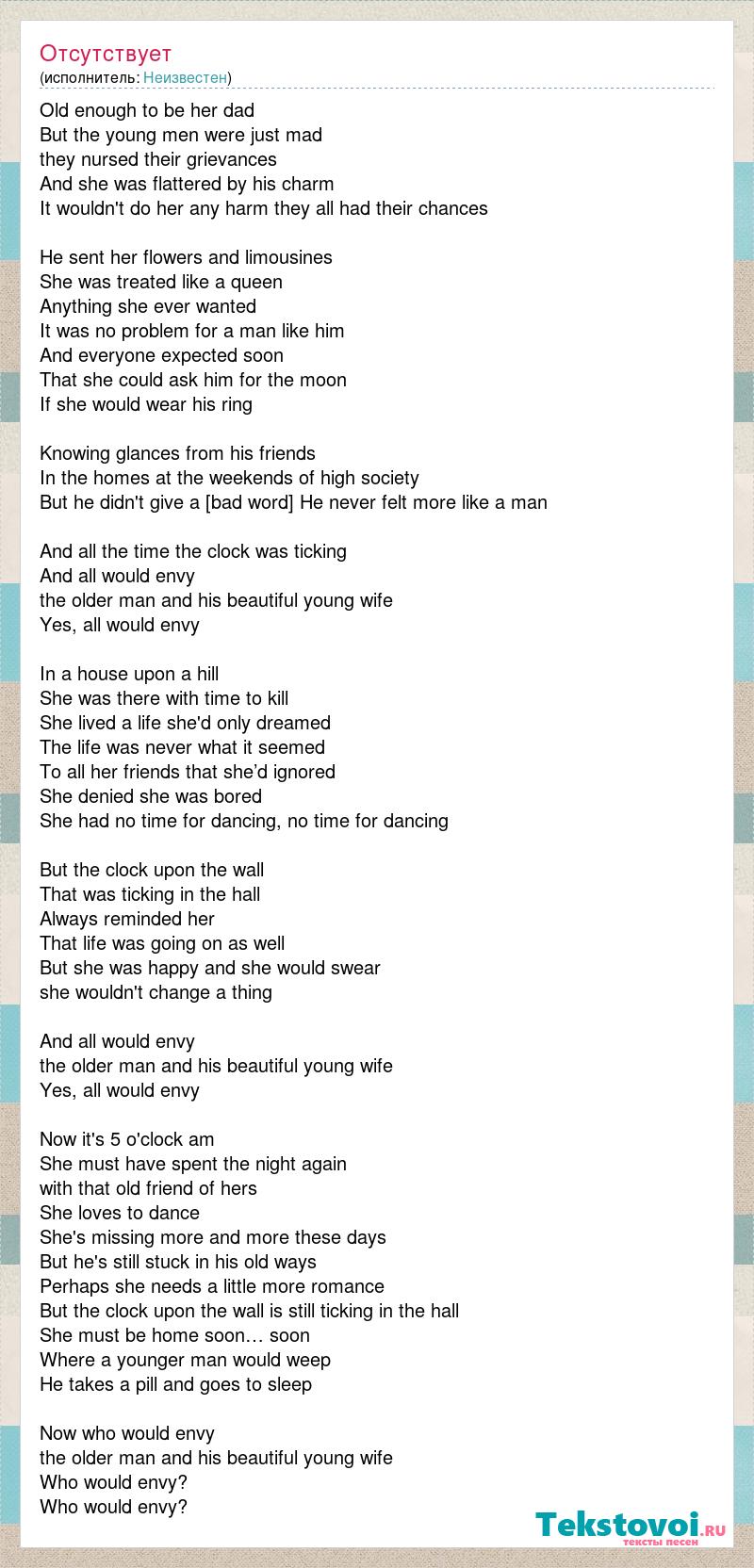 Old enough to be her dad But the young men were just mad they nursed their grievances And she was flattered by his charm It wouldn't do her any harm they all had their chances He sent her flowers and limousines She was treated like a queen Anything she ever wanted It was no problem for a man like him And everyone expected soon That she could ask him for the moon If she would wear his ring Knowing glances from his friends In the homes at the weekends of high society But he didn't give a [bad word] He never felt more like a man And all the time the clock was ticking And all would envy the older man and his beautiful young wife Yes, all would envy In a house upon a hill She was there with time to kill She lived a life she'd only dreamed The life was never what it seemed To all her friends that she’d ignored She denied she was bored She had no time for dancing, no time for dancing But the clock upon the wall That was ticking in the hall Always reminded her That life was going on as well But she was happy and she would swear she wouldn't change a thing And all would envy the older man and his beautiful young wife Yes, all would envy Now it's 5 o'clock am She must have spent the night again with that old friend of hers She loves to dance She's missing more and more these days But he's still stuck in his old ways Perhaps she needs a little more romance But the clock upon the wall is still ticking in the hall She must be home soon… soon Where a younger man would weep He takes a pill and goes to sleep Now who would envy the older man and his beautiful young wife Who would envy? Who would envy?