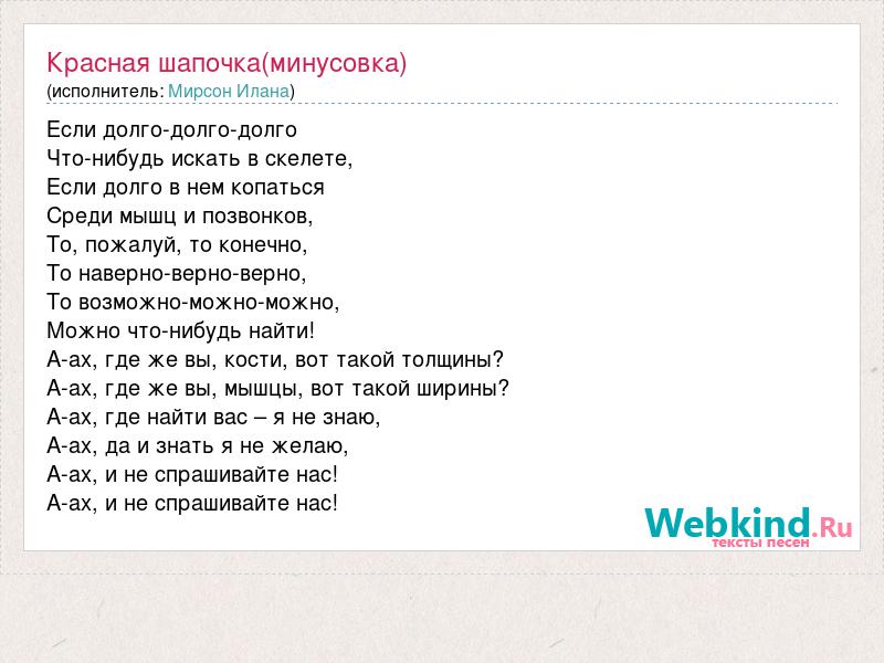 Если долго-долго-долго Что-нибудь искать в скелете, Если долго в нем копаться Среди мышц и позвонков, То, пожалуй, то конечно, То наверно-верно-верно, То возможно-можно-можно, Можно что-нибудь найти! А-ах, где же вы, кости, вот такой толщины? А-ах, где же вы, мышцы, вот такой ширины? А-ах, где найти вас – я не знаю, А-ах, да и знать я не желаю, А-ах, и не спрашивайте нас! А-ах, и не спрашивайте нас!