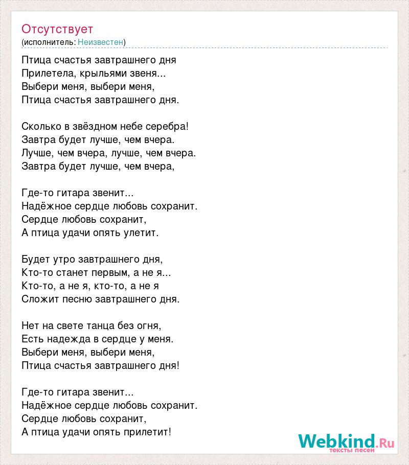 Птица счастья завтрашнего дня Прилетела, крыльями звеня... Выбери меня, выбери меня, Птица счастья завтрашнего дня. Сколько в звёздном небе серебра! Завтра будет лучше, чем вчера. Лучше, чем вчера, лучше, чем вчера. Завтра будет лучше, чем вчера, Где-то гитара звенит... Надёжное сердце любовь сохранит. Сердце любовь сохранит, А птица удачи опять улетит. Будет утро завтрашнего дня, Кто-то станет первым, а не я... Кто-то, а не я, кто-то, а не я Сложит песню завтрашнего дня. Нет на свете танца без огня, Есть надежда в сердце у меня. Выбери меня, выбери меня, Птица счастья завтрашнего дня! Где-то гитара звенит... Надёжное сердце любовь сохранит. Сердце любовь сохранит, А птица удачи опять прилетит!
