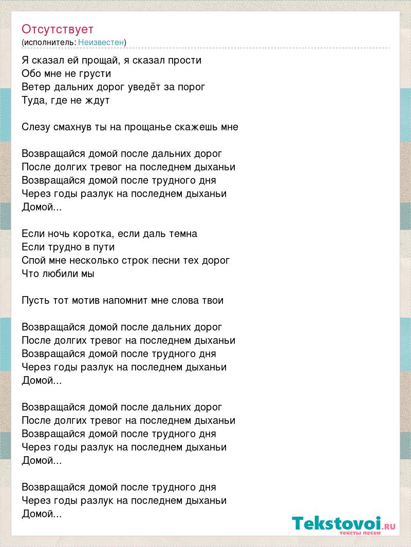 Я сказал ей прощай, я сказал прости Обо мне не грусти Ветер дальних дорог уведёт за порог Туда, где не ждут Слезу смахнув ты на прощанье скажешь мне Возвращайся домой после дальних дорог После долгих тревог на последнем дыханьи Возвращайся домой после трудного дня Через годы разлук на последнем дыханьи Домой... Если ночь коротка, если даль темна Если трудно в пути Спой мне несколько строк песни тех дорог Что любили мы Пусть тот мотив напомнит мне слова твои Возвращайся домой после дальних дорог После долгих тревог на последнем дыханьи Возвращайся домой после трудного дня Через годы разлук на последнем дыханьи Домой... Возвращайся домой после дальних дорог После долгих тревог на последнем дыханьи Возвращайся домой после трудного дня Через годы разлук на последнем дыханьи Домой... Возвращайся домой после трудного дня Через годы разлук на последнем дыханьи Домой...