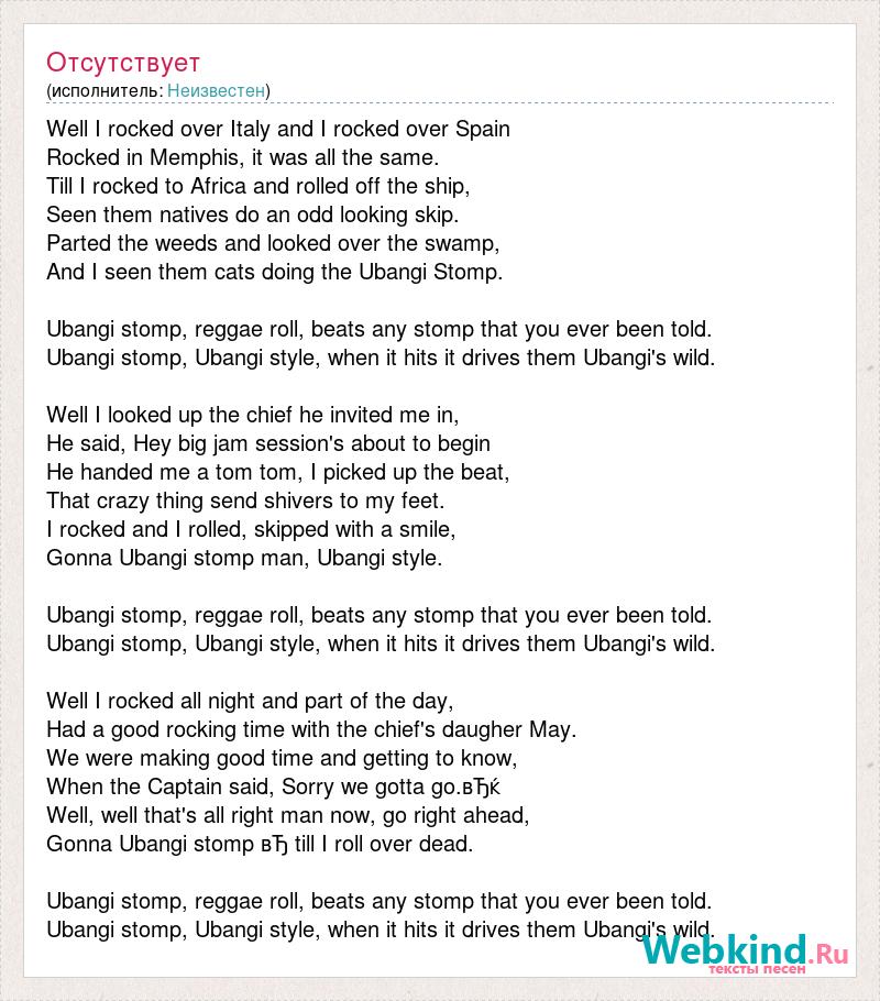 Well I rocked over Italy and I rocked over Spain Rocked in Memphis, it was all the same. Till I rocked to Africa and rolled off the ship, Seen them natives do an odd looking skip. Parted the weeds and looked over the swamp, And I seen them cats doing the Ubangi Stomp. Ubangi stomp, reggae roll, beats any stomp that you ever been told. Ubangi stomp, Ubangi style, when it hits it drives them Ubangi's wild. Well I looked up the chief he invited me in, He said, Hey big jam session's about to begin He handed me a tom tom, I picked up the beat, That crazy thing send shivers to my feet. I rocked and I rolled, skipped with a smile, Gonna Ubangi stomp man, Ubangi style. Ubangi stomp, reggae roll, beats any stomp that you ever been told. Ubangi stomp, Ubangi style, when it hits it drives them Ubangi's wild. Well I rocked all night and part of the day, Had a good rocking time with the chief's daugher May. We were making good time and getting to know, When the Captain said, Sorry we gotta go.” Well, well that's all right man now, go right ahead, Gonna Ubangi stomp †till I roll over dead. Ubangi stomp, reggae roll, beats any stomp that you ever been told. Ubangi stomp, Ubangi style, when it hits it drives them Ubangi's wild.