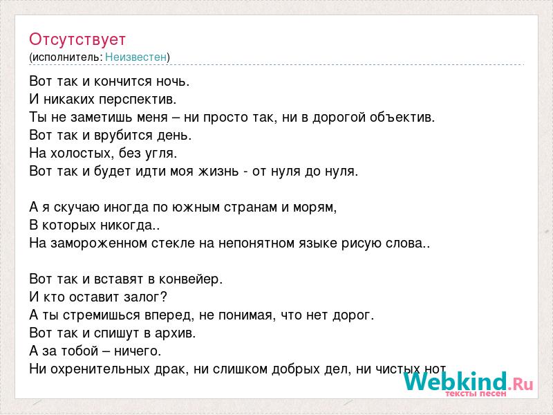 Вот так и кончится ночь. И никаких перспектив. Ты не заметишь меня – ни просто так, ни в дорогой объектив. Вот так и врубится день. На холостых, без угля. Вот так и будет идти моя жизнь - от нуля до нуля. А я скучаю иногда по южным странам и морям, В которых никогда.. На замороженном стекле на непонятном языке рисую слова.. Вот так и вставят в конвейер. И кто оставит залог? А ты стремишься вперед, не понимая, что нет дорог. Вот так и спишут в архив. А за тобой – ничего. Ни охренительных драк, ни слишком добрых дел, ни чистых нот