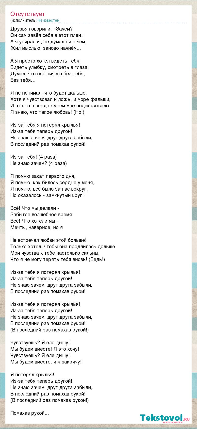 Друзья говорили: «Зачем? Он сам завёл себя в этот плен» А я упирался, не думал ни о чём, Жил мыслью: заново начнём... А я просто хотел видеть тебя, Видеть улыбку, смотреть в глаза, Думал, что нет ничего без тебя, Без тебя… Я не понимал, что будет дальше, Хотя я чувствовал и ложь, и море фальши, И что-то в сердце моём мне подсказывало: Я знаю, что такое любовь! (Но!) Из-за тебя я потерял крылья! Из-за тебя теперь другой! Не знаю зачем, друг друга забыли, В последний раз помахав рукой! Из-за тебя! (4 раза) Не знаю зачем? (4 раза) Я помню закат первого дня, Я помню, как билось сердце у меня, Я помню, всё было за нас вокруг, Но оказалось - замкнутый круг! Всё! Что мы делали - Забытое волшебное время Всё! Что хотели мы - Мечты, наверное, но я Не встречал любви этой больше! Только хотел, чтобы она продлилась дольше. Мои чувства к тебе настолько сильны, Что я не могу терять тебя вновь! (Ведь!) Из-за тебя я потерял крылья! Из-за тебя теперь другой! Не знаю зачем, друг друга забыли, В последний раз помахав рукой! Из-за тебя я потерял крылья! Из-за тебя теперь другой! Не знаю зачем, друг друга забыли, В последний раз помахав рукой! (В последний раз помахав рукой!) Чувствуешь? Я еле дышу! Мы будем вместе! Я это хочу! Чувствуешь? Я еле дышу! Мы будем вместе, и я закричу! Я потерял крылья! Из-за тебя теперь другой! Не знаю зачем, друг друга забыли, В последний раз помахав рукой! (В последний раз помахав рукой!) Помахав рукой...