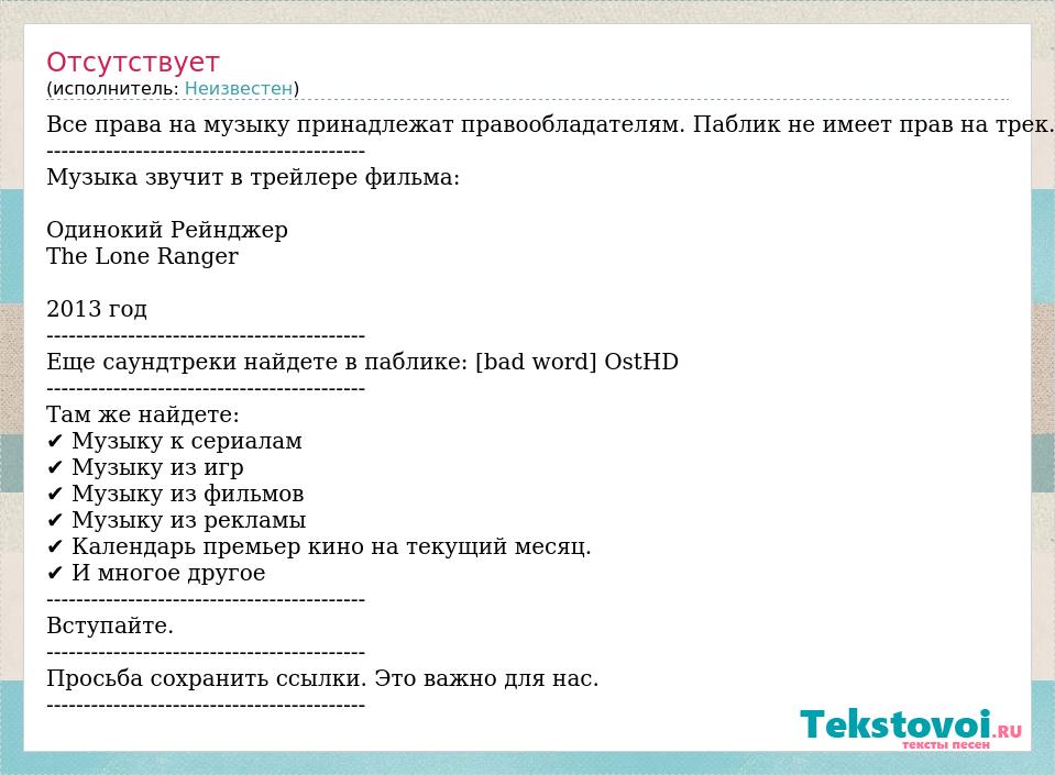 Все права на музыку принадлежат правообладателям. Паблик не имеет прав на трек. ------------------------------------------- Музыка звучит в трейлере фильма: Одинокий Рейнджер The Lone Ranger 2013 год ------------------------------------------- Еще саундтреки найдете в паблике: [bad word] OstHD ------------------------------------------- Там же найдете: ✔ Музыку к сериалам ✔ Музыку из игр ✔ Музыку из фильмов ✔ Музыку из рекламы ✔ Календарь премьер кино на текущий месяц. ✔ И многое другое ------------------------------------------- Вступайте. ------------------------------------------- Просьба сохранить ссылки. Это важно для нас. -------------------------------------------