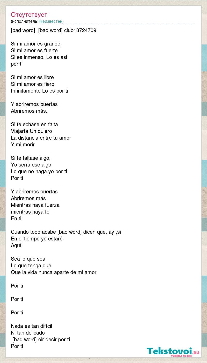 [bad word] [bad word] club18724709 Si mi amor es grande, Si mi amor es fuerte Si es inmenso, Lo es asi por ti Si mi amor es libre Si mi amor es fiero Infinitamente Lo es por ti Y abriremos puertas Abriremos más. Si te echase en falta Viajaría Un quiero La distancia entre tu amor Y mi morir Si te faltase algo, Yo sería ese algo Lo que no haga yo por ti Por ti Y abriremos puertas Abriremos más Mientras haya fuerza mientras haya fe En ti Cuando todo acabe [bad word] dicen que, ay ,si En el tiempo yo estaré Aquí Sea lo que sea Lo que tenga que Que la vida nunca aparte de mi amor Por ti Por ti Por ti Nada es tan difícil Ni tan delicado [bad word] oir decir por ti Por ti