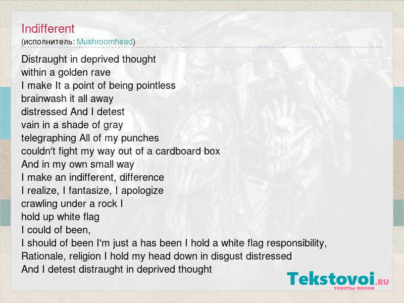 Distraught in deprived thought within a golden rave I make It a point of being pointless brainwash it all away distressed And I detest vain in a shade of gray telegraphing All of my punches couldn't fight my way out of a cardboard box And in my own small way I make an indifferent, difference I realize, I fantasize, I apologize crawling under a rock I hold up white flag I could of been, I should of been I'm just a has been I hold a white flag responsibility, Rationale, religion I hold my head down in disgust distressed And I detest distraught in deprived thought