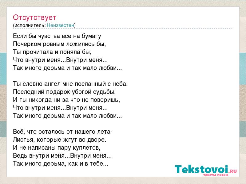 Если бы чувства все на бумагу Почерком ровным ложились бы, Ты прочитала и поняла бы, Что внутри меня...Внутри меня... Так много дерьма и так мало любви... Ты словно ангел мне посланный с неба. Последний подарок убогой судьбы. И ты никогда ни за что не поверишь, Что внутри меня...Внутри меня... Так много дерьма и так мало любви... Всё, что осталось от нашего лета- Листья, которые жгут во дворе. И не написаны пару куплетов, Ведь внутри меня...Внутри меня... Так много дерьма, как и в тебе...